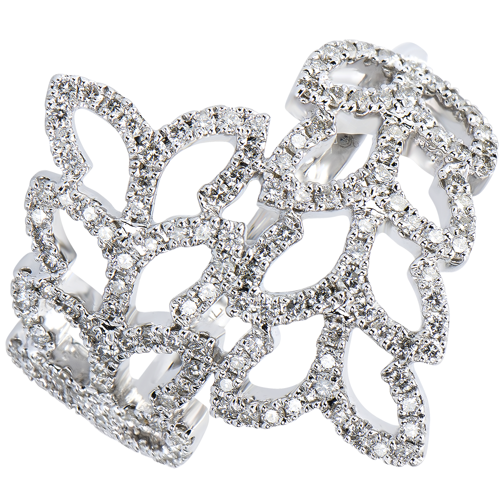 Idylliczny romans wyrażony świeżym i kobiecym pierścionkiem, w którym przeplatają się liście wysadzane diamentami. Cała delikatność form występujących w przyrodzie wyrażona w subtelnym, prawie baśniowym pierścionku.