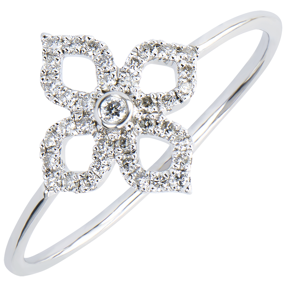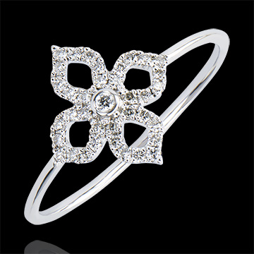Minimalistyczny motyw kwiatowy o konturach wysadzanych diamentami z diamentem środkowym podkreślającym całość. Delikatny i subtelny pierścionek w romantycznym wydaniu.