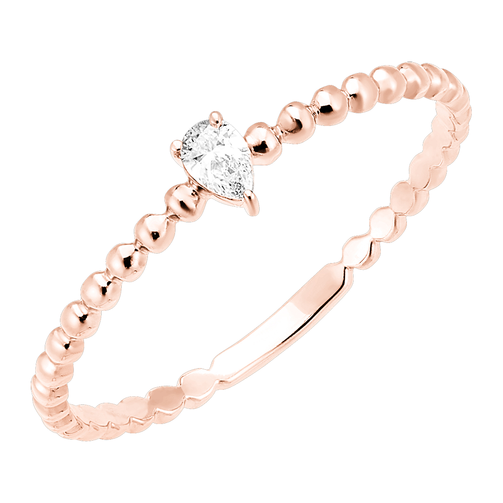 Pierścionek Pojedyncza gruszka wyróżnia się delikatnym diamentem o szlifie gruszki osadzonym na szynie z różowego złota przypominającej swym kształtem ciąg połączonych kuleczek, co nadaje mu odrobinę nowoczesnego szyku.