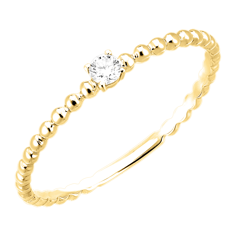 Pierścionek Pojedynczy brylant wyróżnia się delikatnym, okrągłym diamentem osadzonym na szynie z żółtego złota przypominającej swym kształtem ciąg połączonych kuleczek, co nadaje mu odrobinę nowoczesnego szyku.