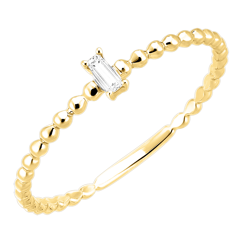 Pierścionek Szmaragdowy Diament wyróżnia się delikatnym diamentem o szlifie szmaragdowym osadzonym na szynie z żółtego złota przypominającej swym kształtem ciąg połączonych kuleczek, co nadaje mu odrobinę nowoczesnego szyku.