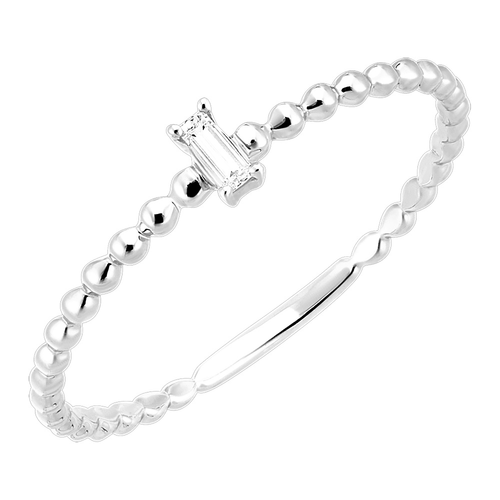 Pierścionek Szmaragdowy Diament wyróżnia się delikatnym diamentem o szlifie szmaragdowym osadzonym na szynie z białego złota przypominającej swym kształtem ciąg połączonych kuleczek, co nadaje mu odrobinę nowoczesnego szyku.