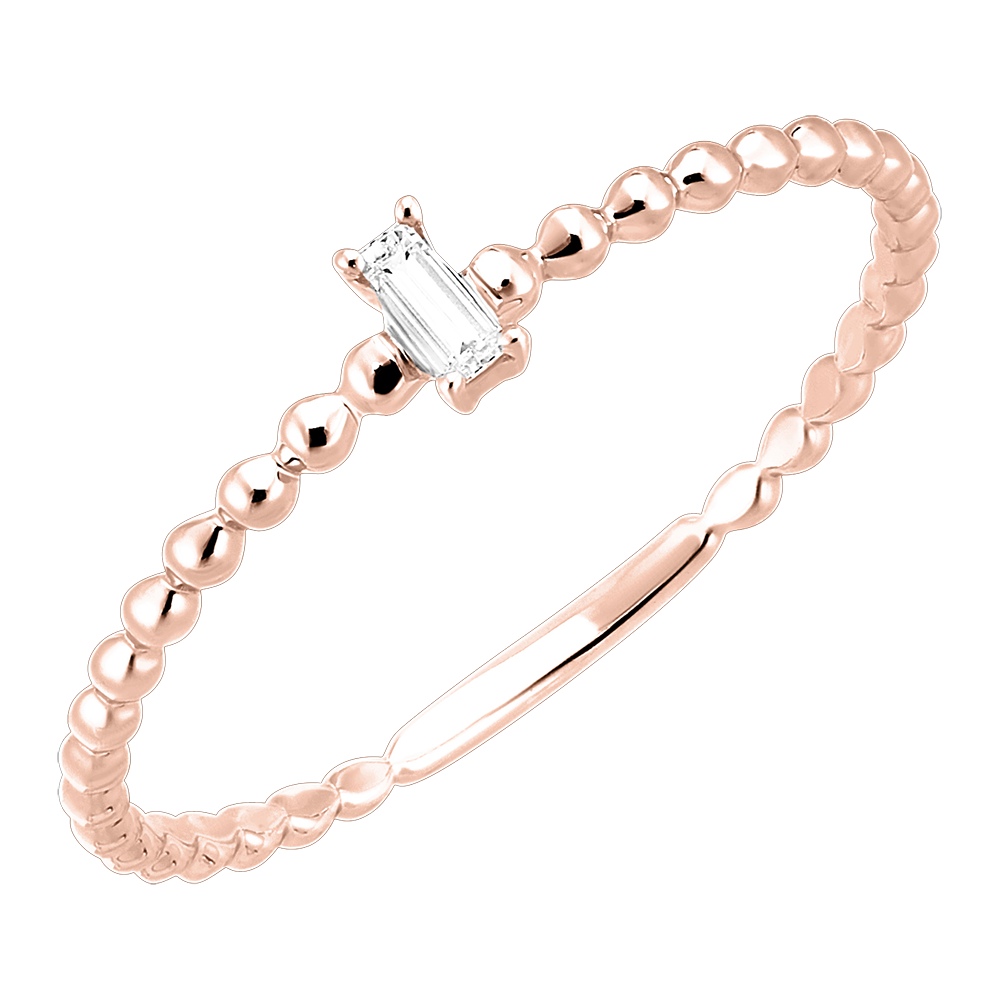Pierścionek Szmaragdowy Diament wyróżnia się delikatnym diamentem o szlifie szmaragdowym osadzonym na szynie z różowego złota przypominającej swym kształtem ciąg połączonych kuleczek, co nadaje mu odrobinę nowoczesnego szyku.
