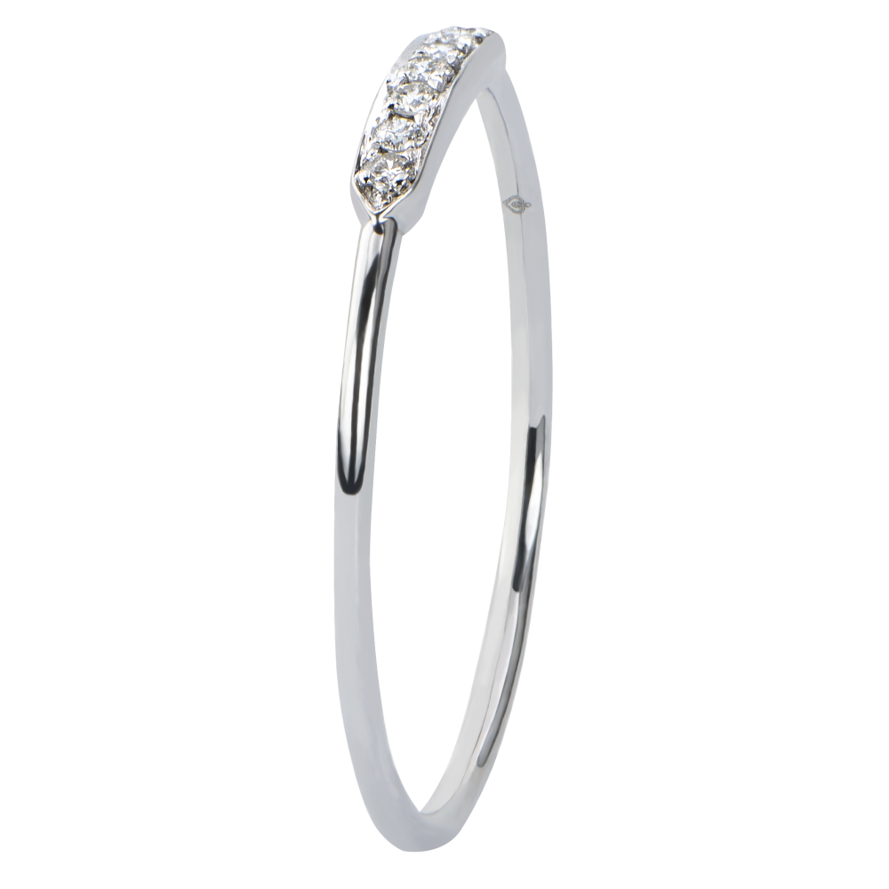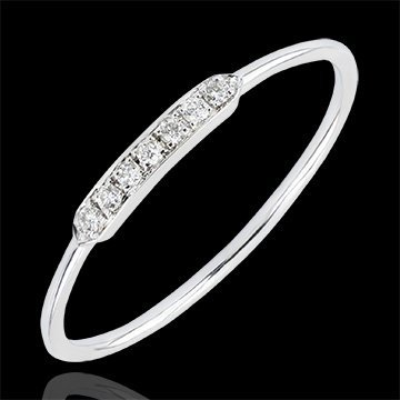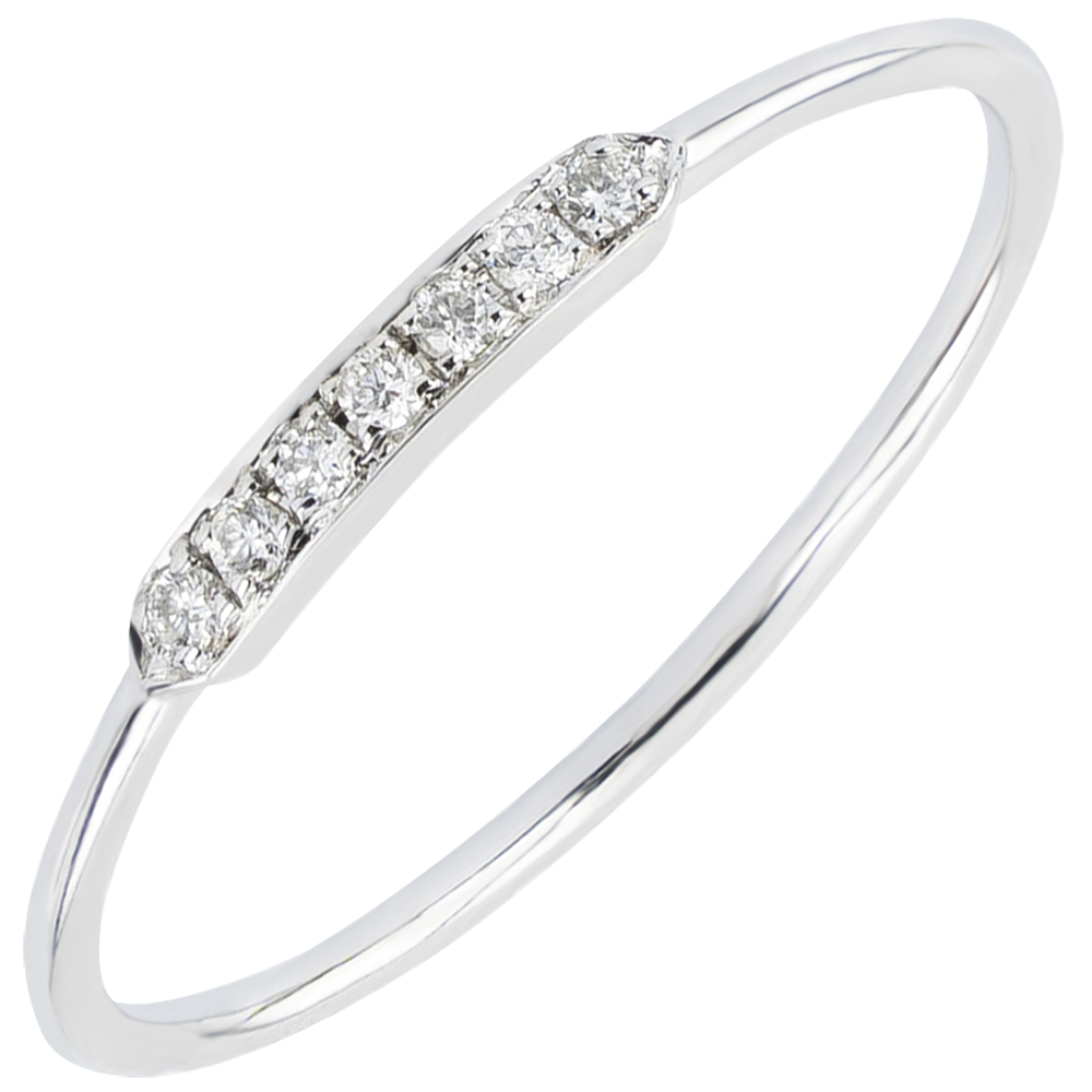 Minimalistyczny i graficzny pierścionek ozdobiony 7 diamentami stanowiącymi doskonałą liczbę. Podstawowe, lecz boskie rozwiązanie.