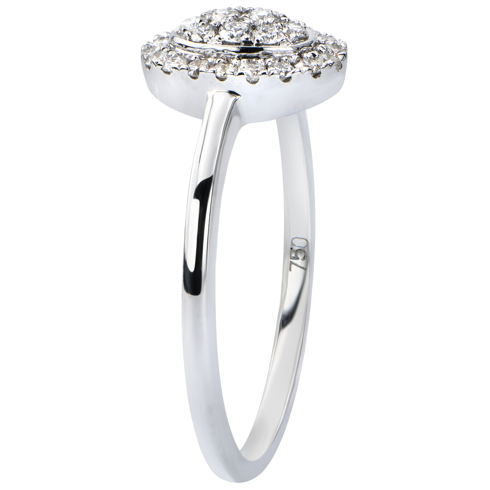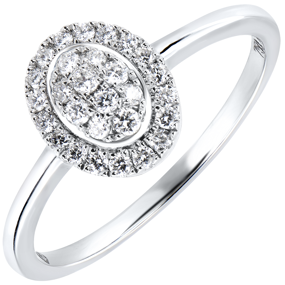 Delikatny blask owalnej oprawy diamentu podkreślonej otoczką z diamentów. Delikatny i subtelny pierścionek o łagodnych liniach.
