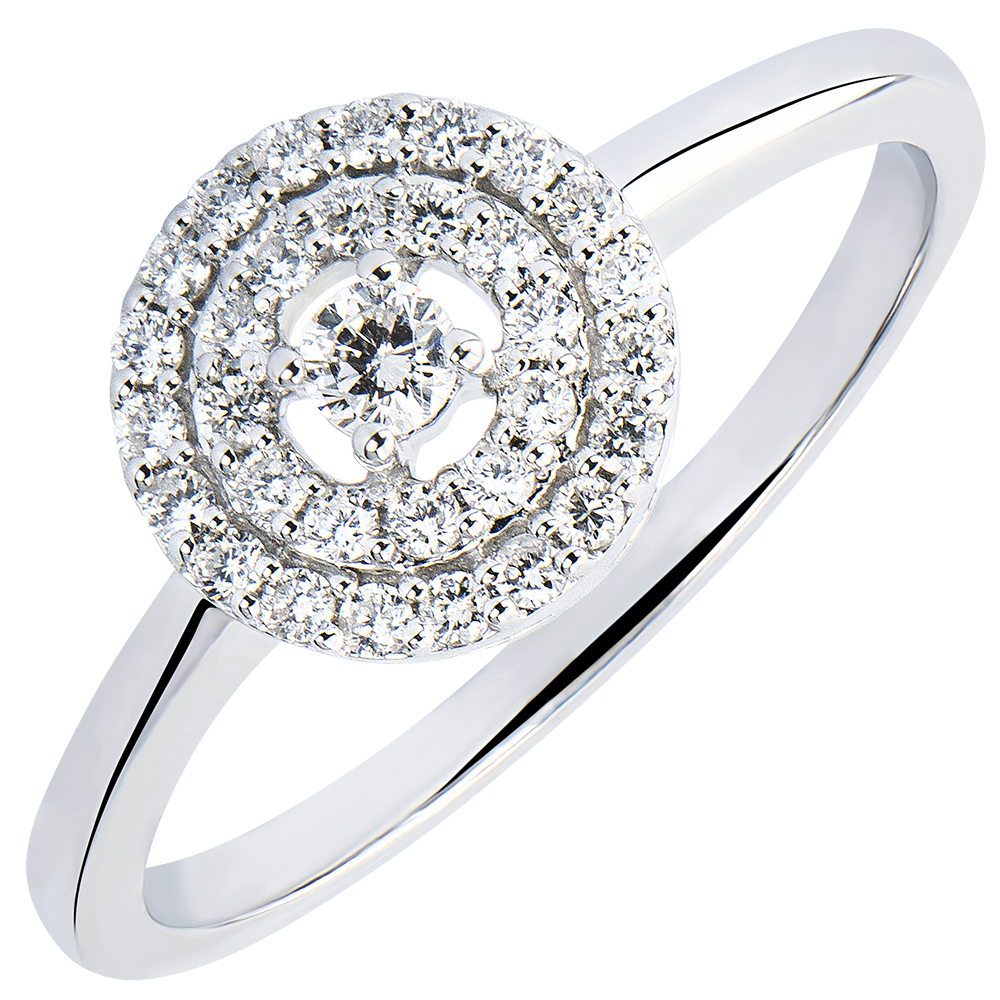 Ciekawy pierścionek zaręczynowy ozdobiony diamentem środkowym otoczonym podwójnym rzędem diamentów. Kunsztowna oprawa zapewniająca migoczący, prawie hipnotyczny blask.