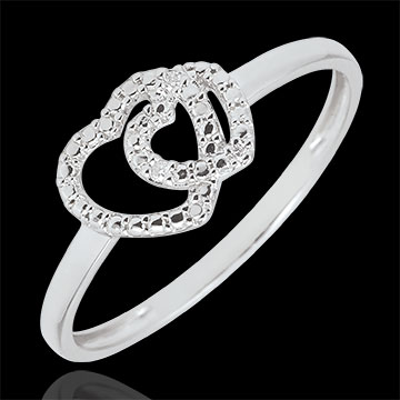 Pierścionek z dwóch serc z białego złota poddanego obróbce na wzór diamentu, wysadzany diamentami przywołującymi czułość i bliskość.