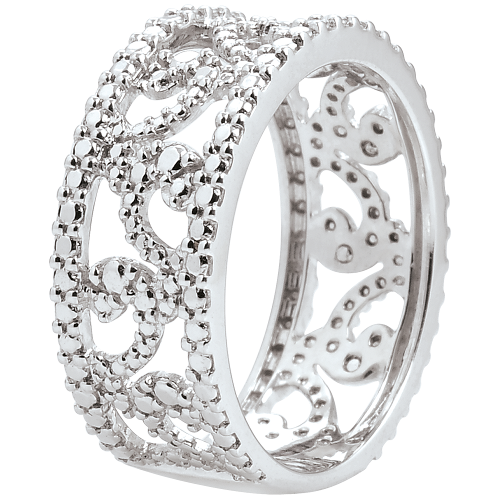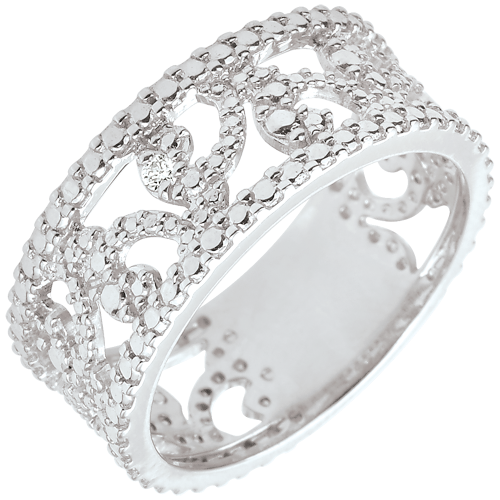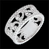 Kobieca i elegancka obrączka z arabeskami z białego złota wykonanymi na wzór diamentów.