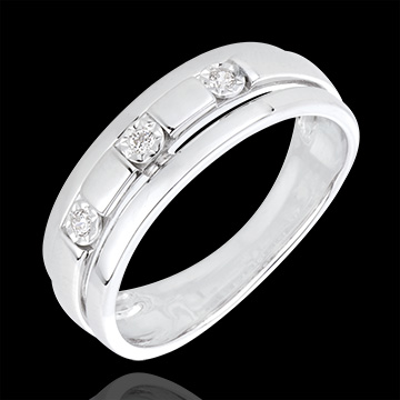 Trzy diamenty w masywnej, wypukłej oprawie z białego złota.