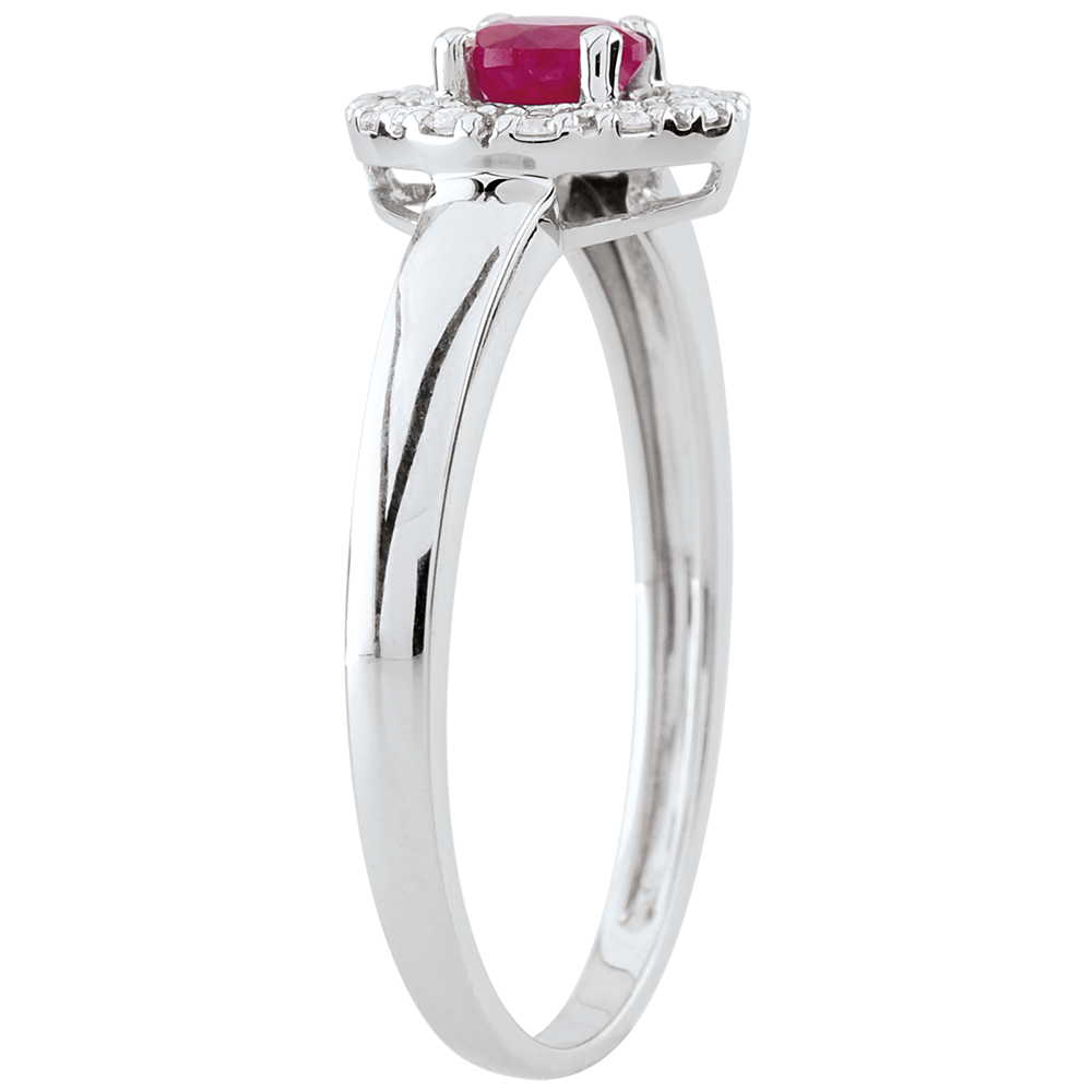 Koło z białego złota wysadzane diamentem stanowi osłonę dla rubinu niczym gniazdo.