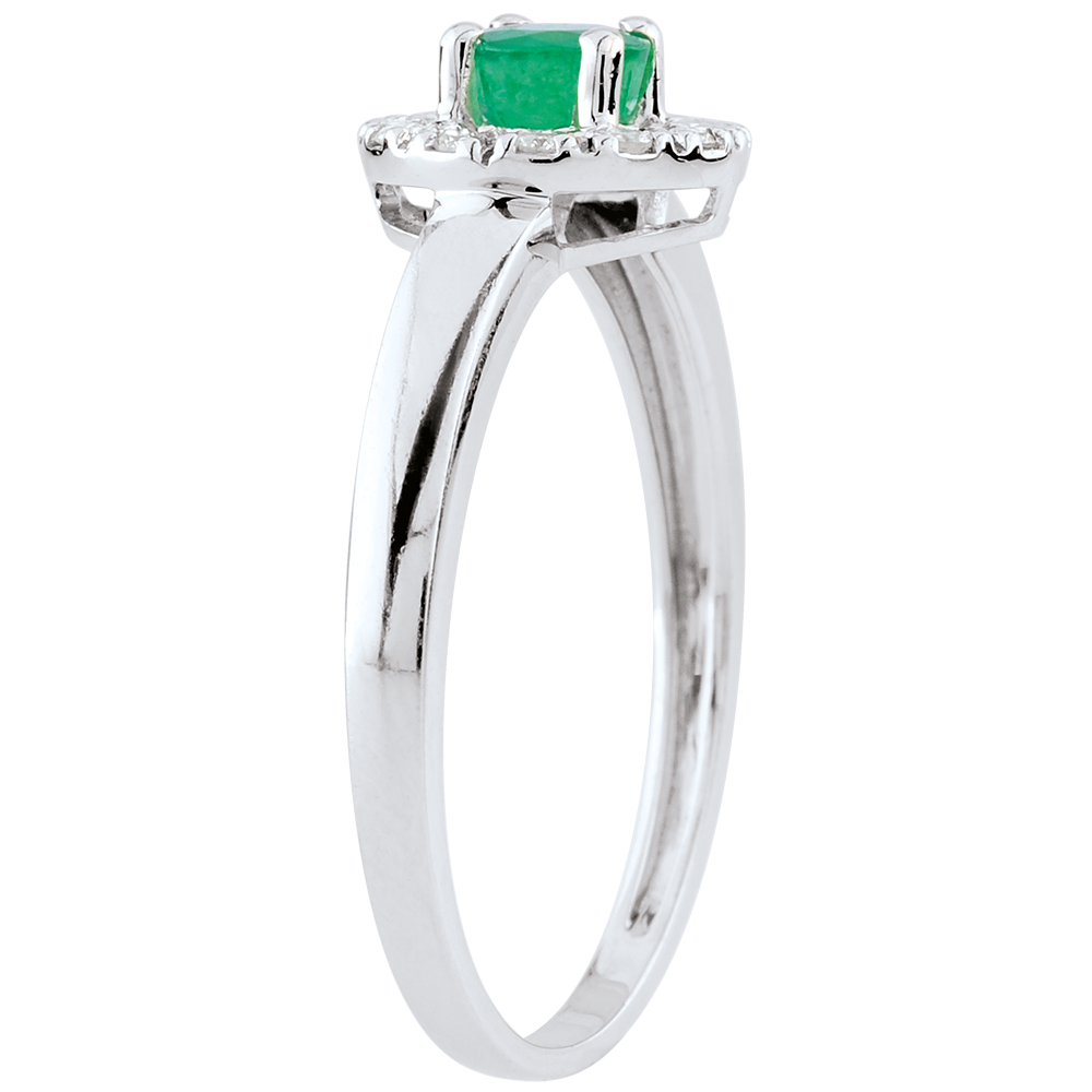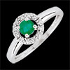 Koło z białego złota wysadzane diamentem stanowi osłonę dla szmaragdu niczym gniazdo.