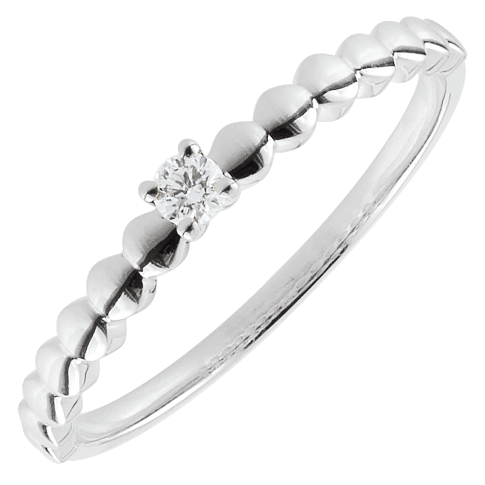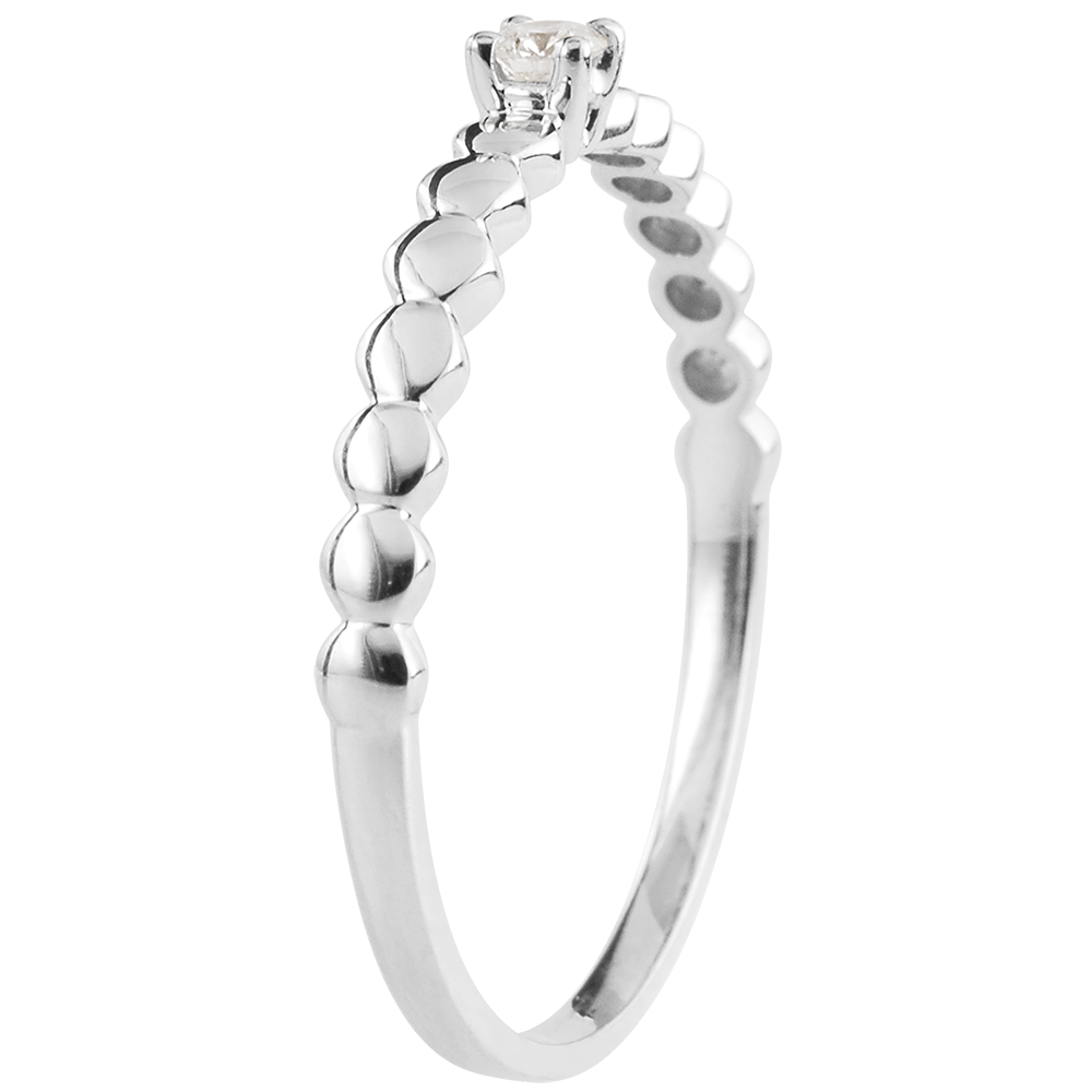 Oprawa przypominająca małe cukierki z białego złota z jednym diamentem w czterech krapach. Oryginalny i kobiecy pierścionek zaręczynowy.