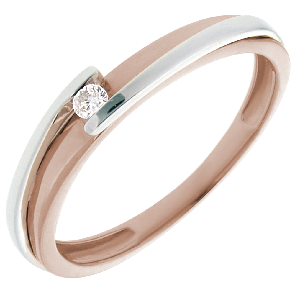 Skromna i klasyczna oprawa oraz siła połączenia złota różowego ze złotem białym, aby delikatnie podkreślić diament środkowy.