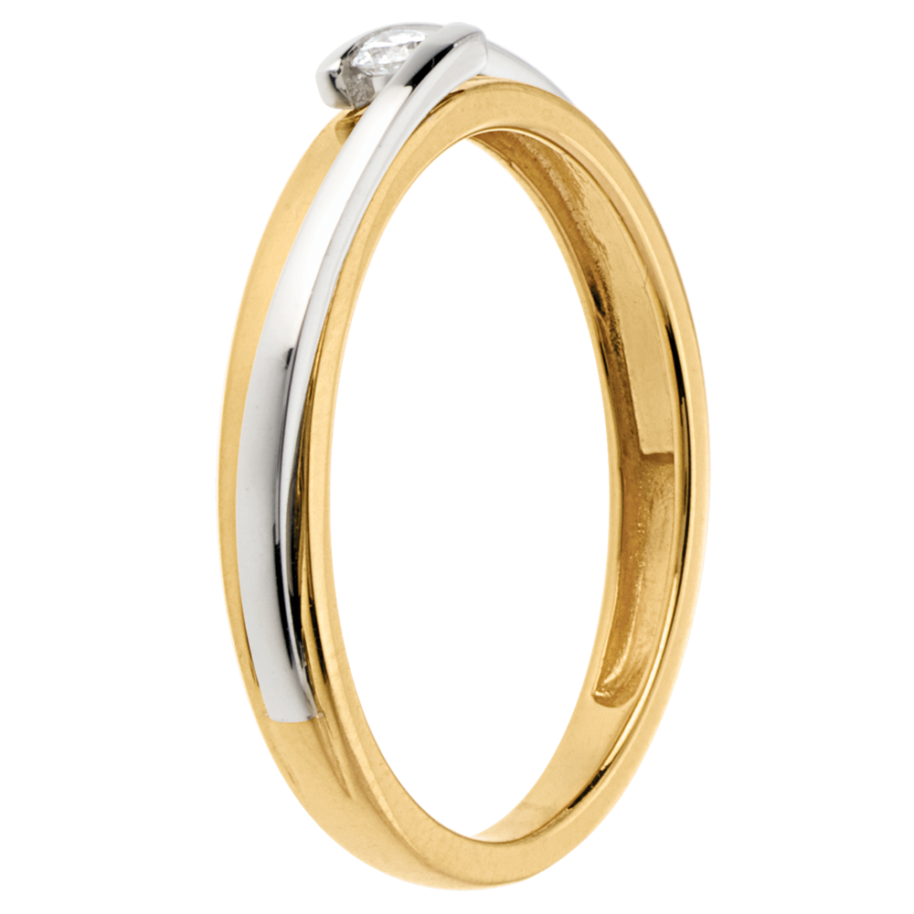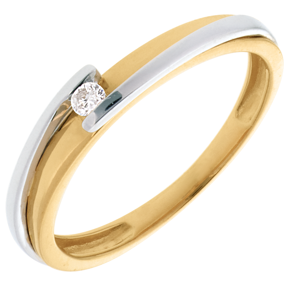 Skromna i klasyczna oprawa oraz siła połączenia złota żółtego ze złotem białym, aby delikatnie podkreślić diament środkowy.