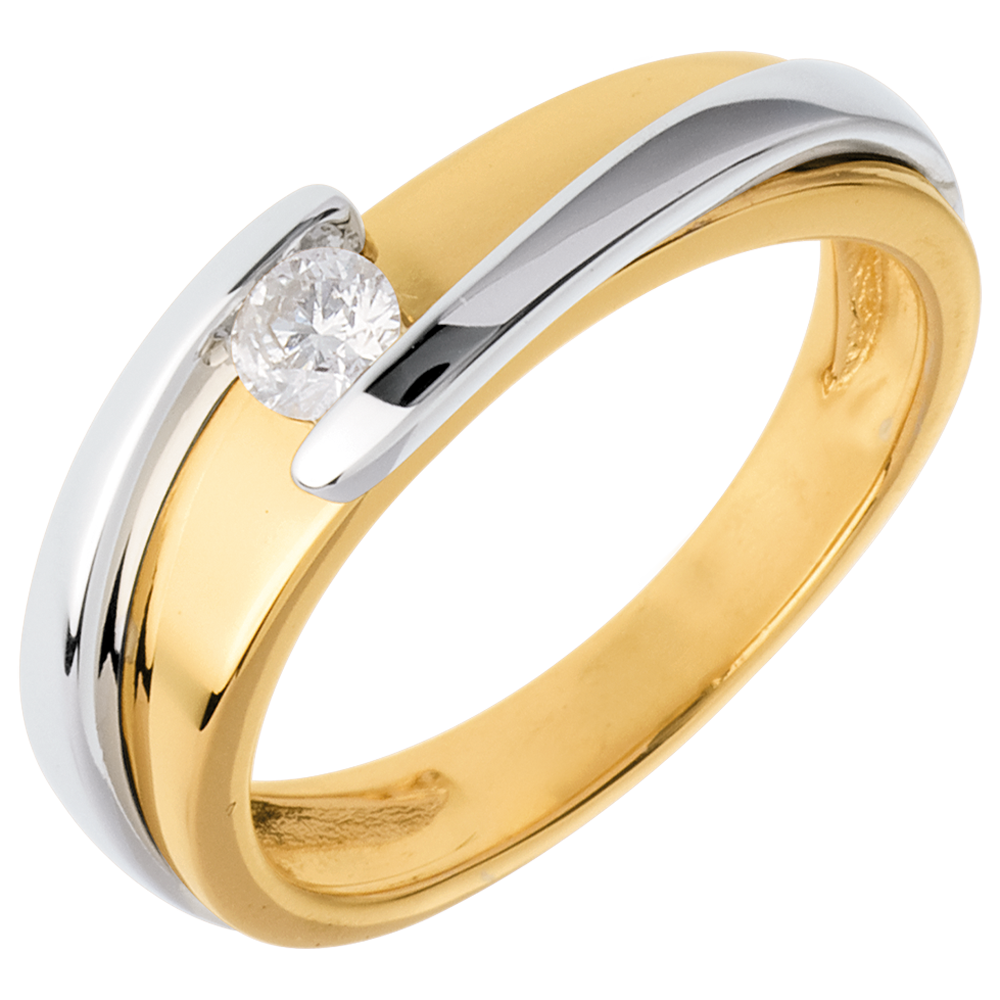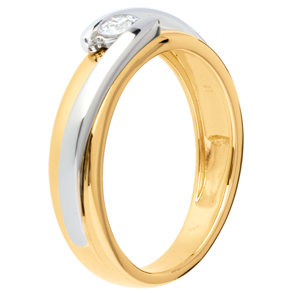 Skromna i klasyczna oprawa oraz siła połączenia złota żółtego ze złotem białym, aby delikatnie podkreślić diament środkowy.