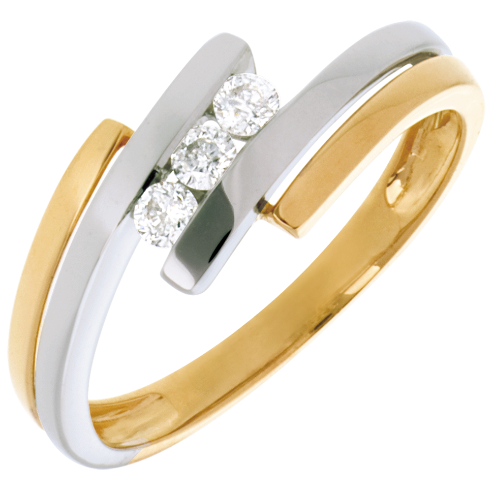 Pierścionek Drogocenne Gniazdo z potrójnym diamentem - Dwie obrączki - złoto białe i złoto żółte 18-karatowe - 3 diamenty