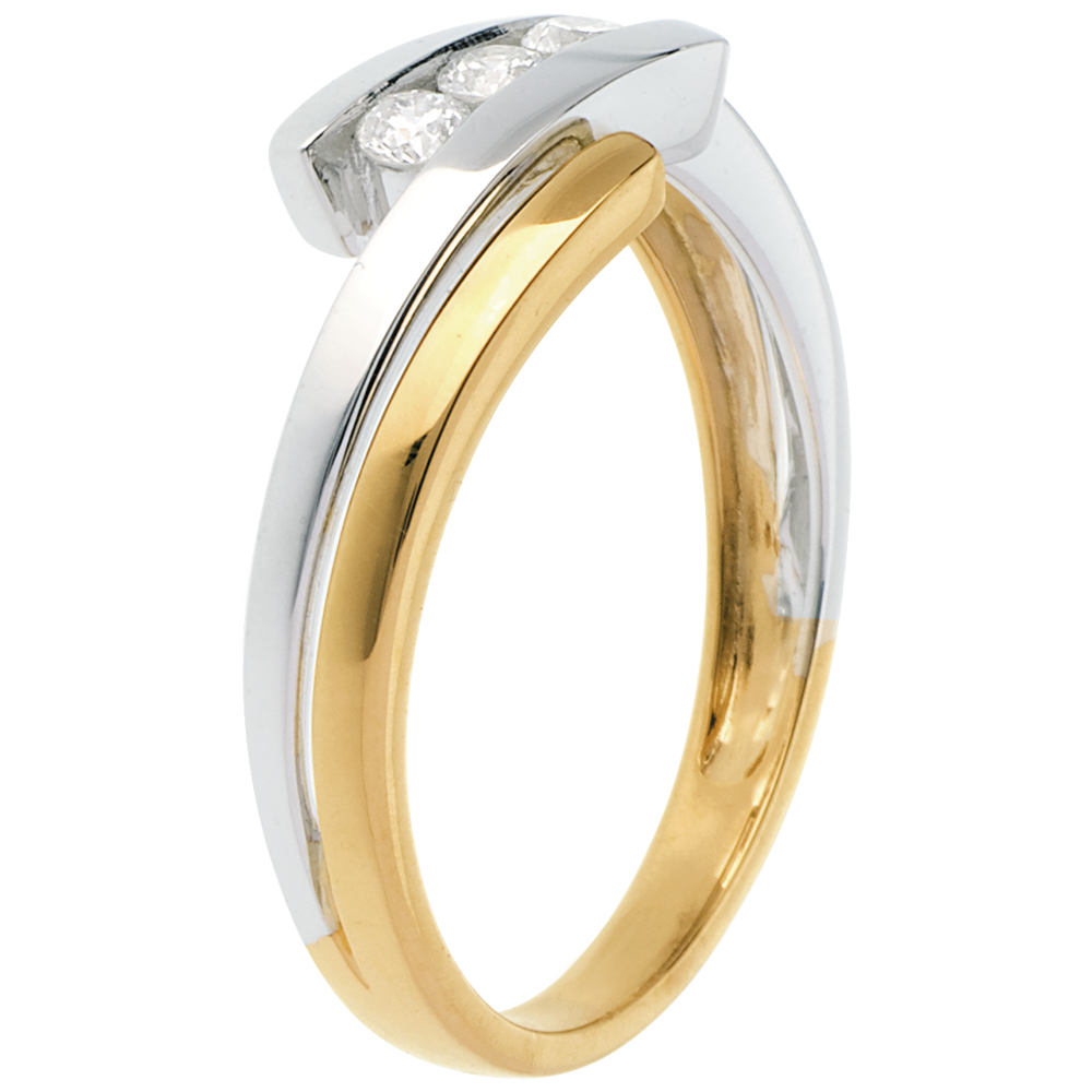 Trzy diamenty wtłoczone między dwie obrączki ze złota żółtego i białego w delikatnym i kobiecym pierścionku.