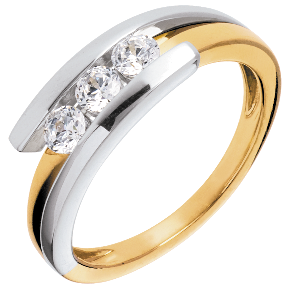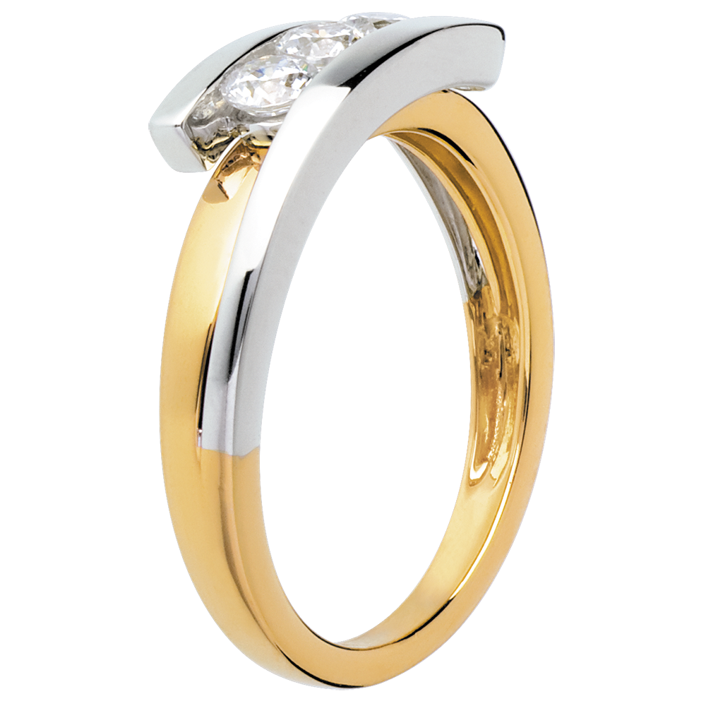 Skromna i klasyczna oprawa oraz siła połączenia złota żółtego ze złotem białym, aby delikatnie podkreślić trzy diamenty.