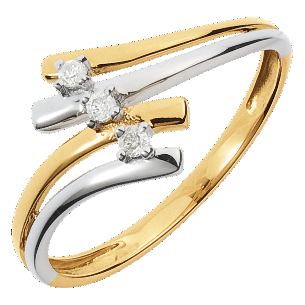 Trzy diamenty podkreślone zręczną oprawą łączącą z werwą i delikatnością złoto białe i złoto żółte.