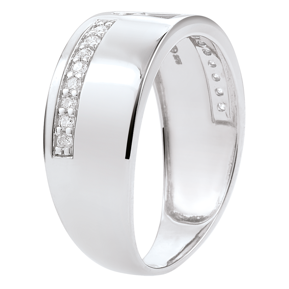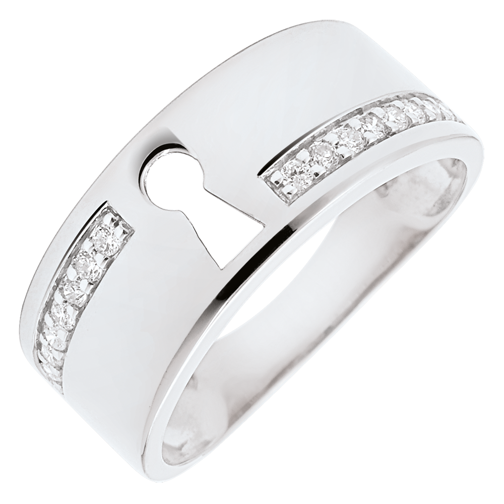 Dziurka od klucza na szerokiej oprawie z białego złota wysadzanej diamentami