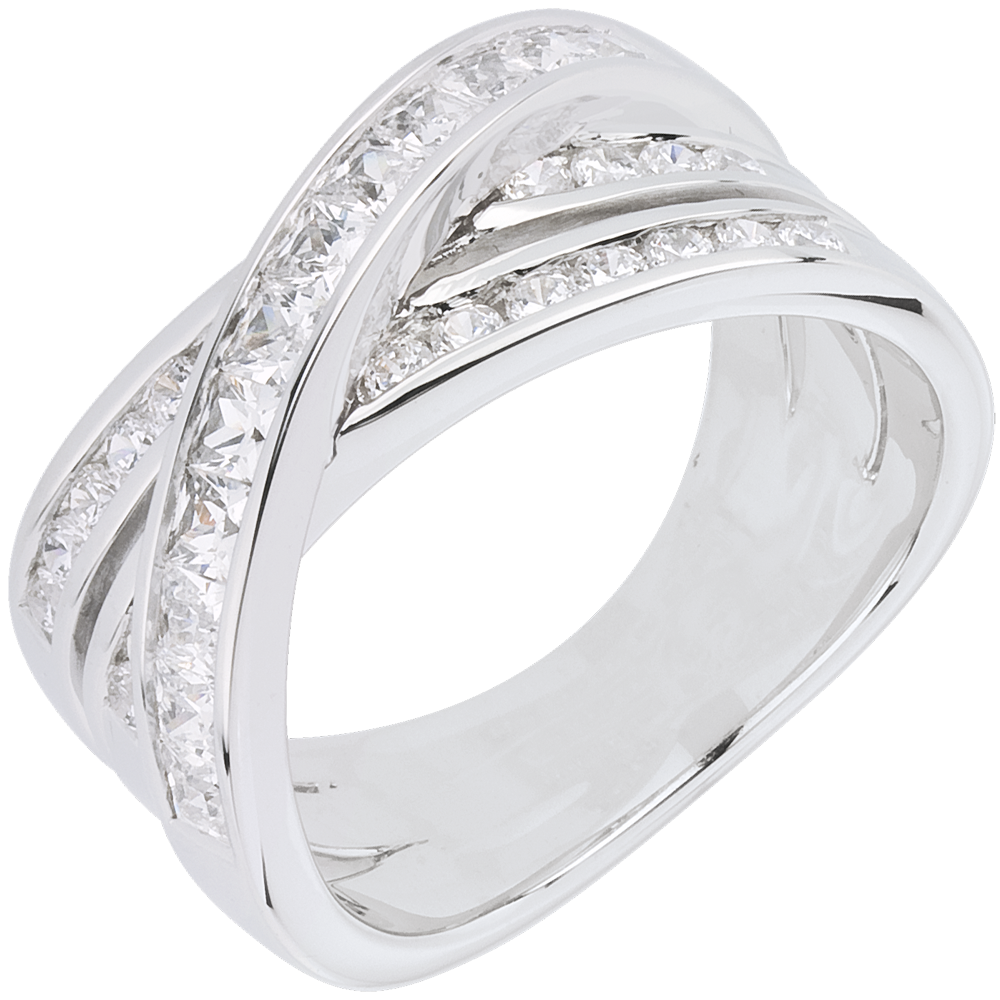 Trzy połączone pierścienie z białego złota z diamentami o szlifie „princessa” błyszczą, podkreślając subtelną różnicę.
