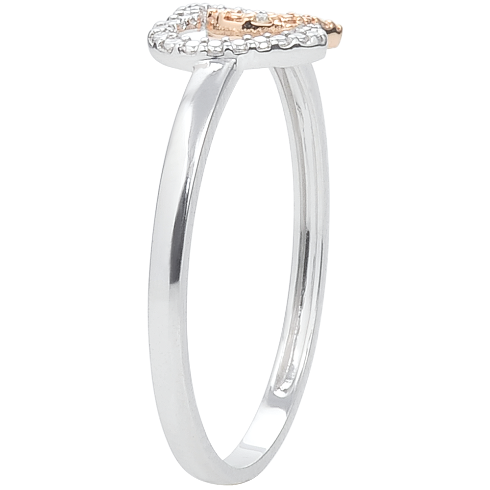 Pierścionek z dwóch serc z białego i różowego złota poddanego obróbce na wzór diamentu, wysadzany diamentami przywołującymi czułość i bliskość.