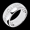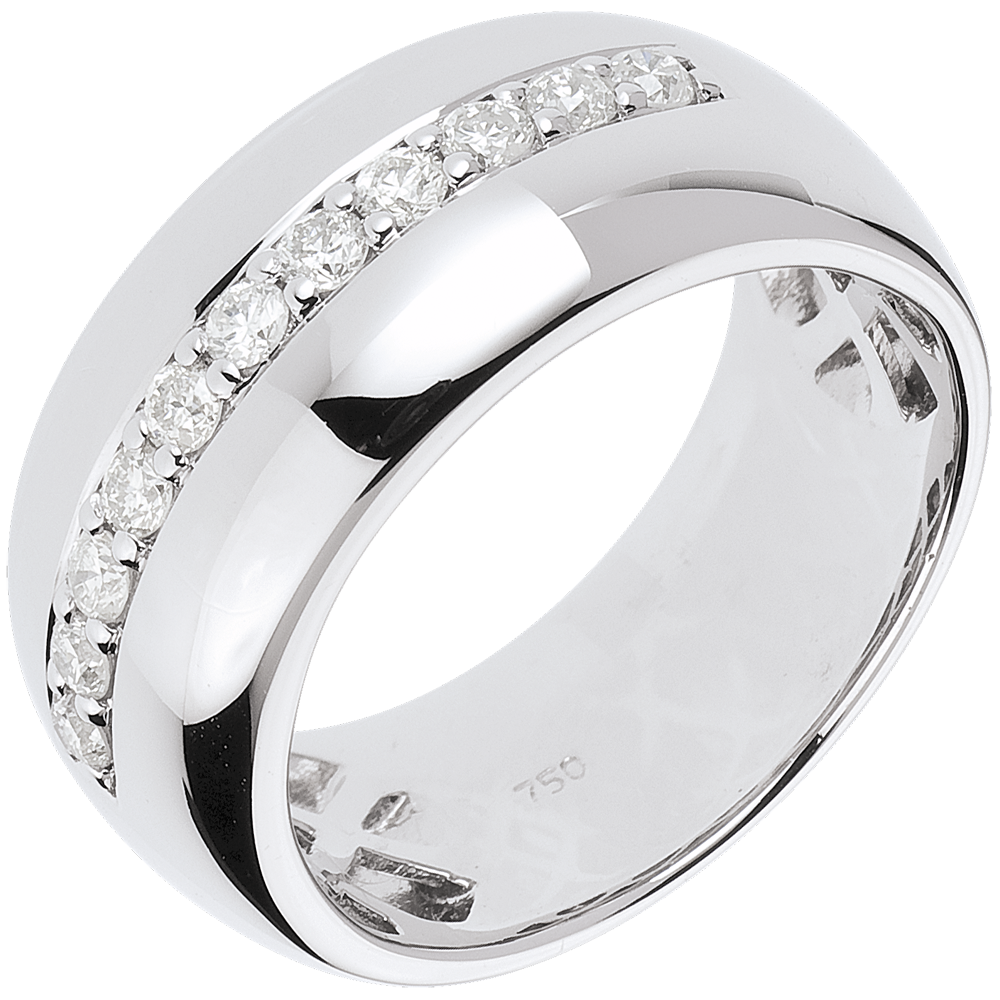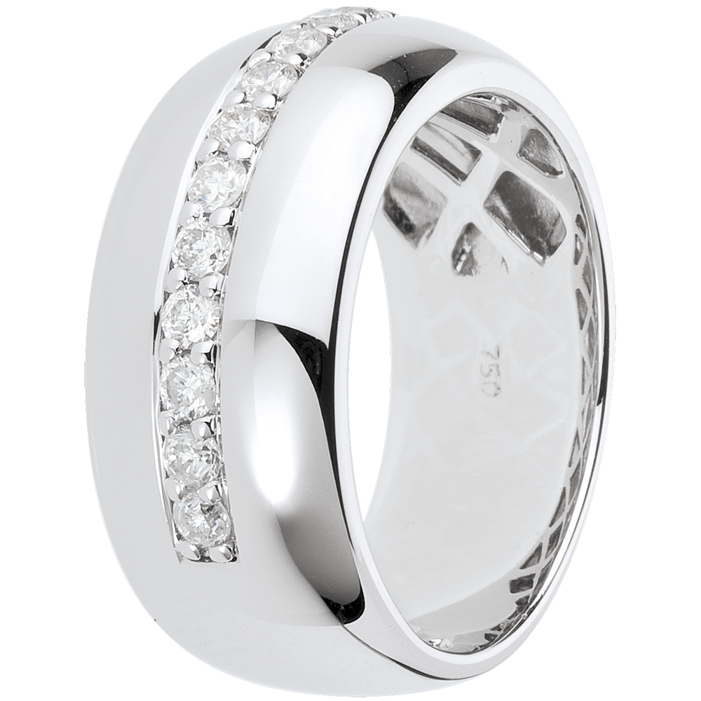 Luksusowa i błyszcząca szeroka obrączka z białego złota z rzędem diamentów. Oszczędna i elegancka forma.