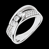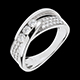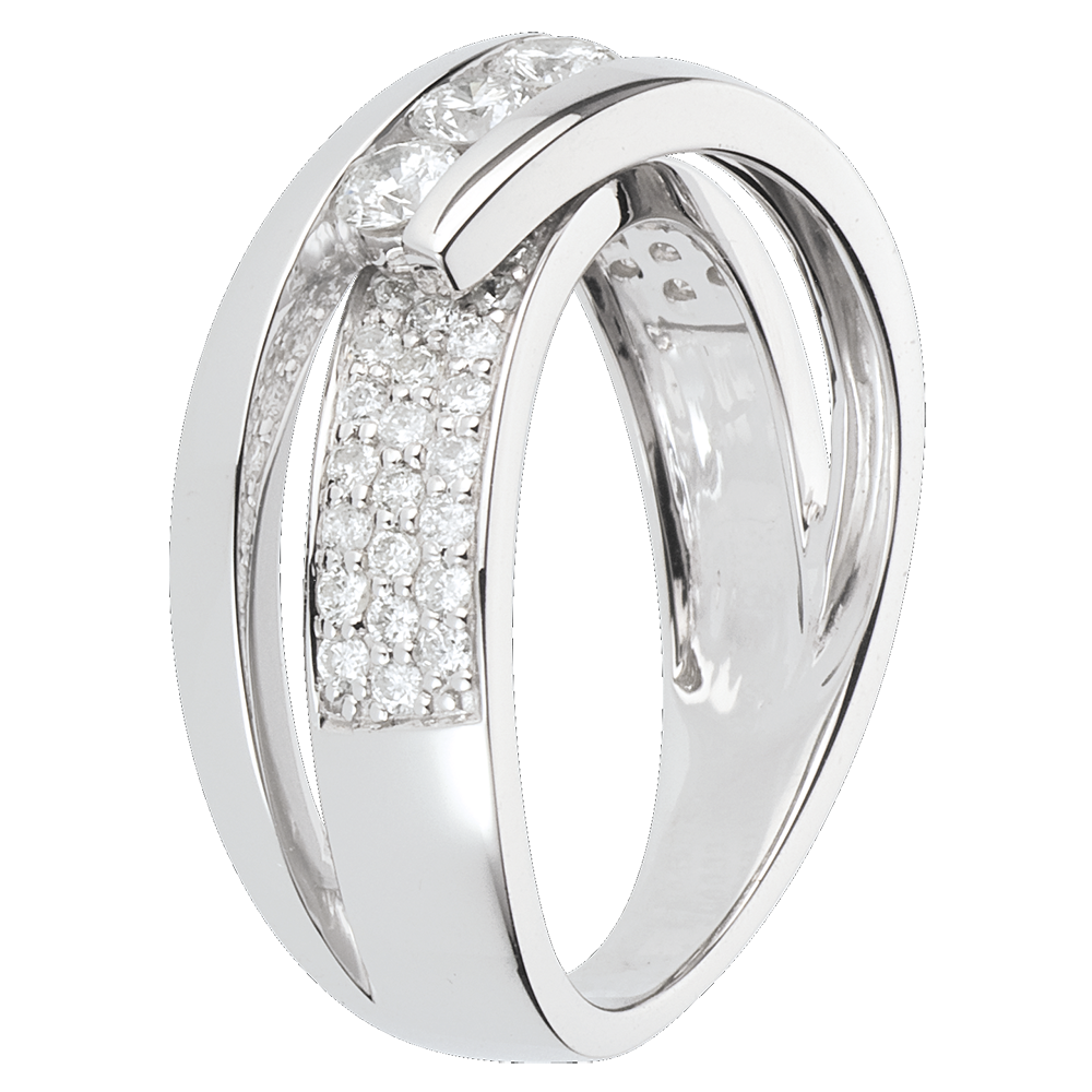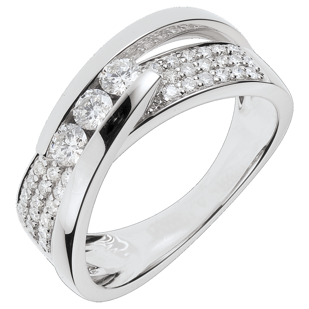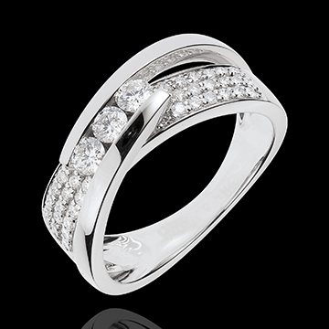 Trzy diamenty w delikatnym uścisku, w sposób wyważony oprawione między dwoma łukami z białego złota na oprawie w połowie wysadzanej diamentami.