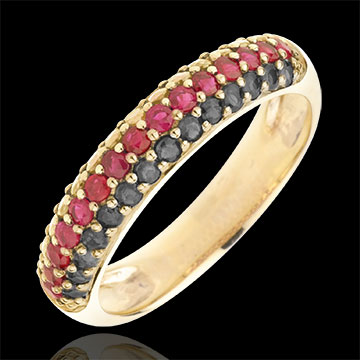 Subtelne połączenie złota, diamentu i kamieni szlachetnych w pierścionku w kolorach flagi niemieckiej.