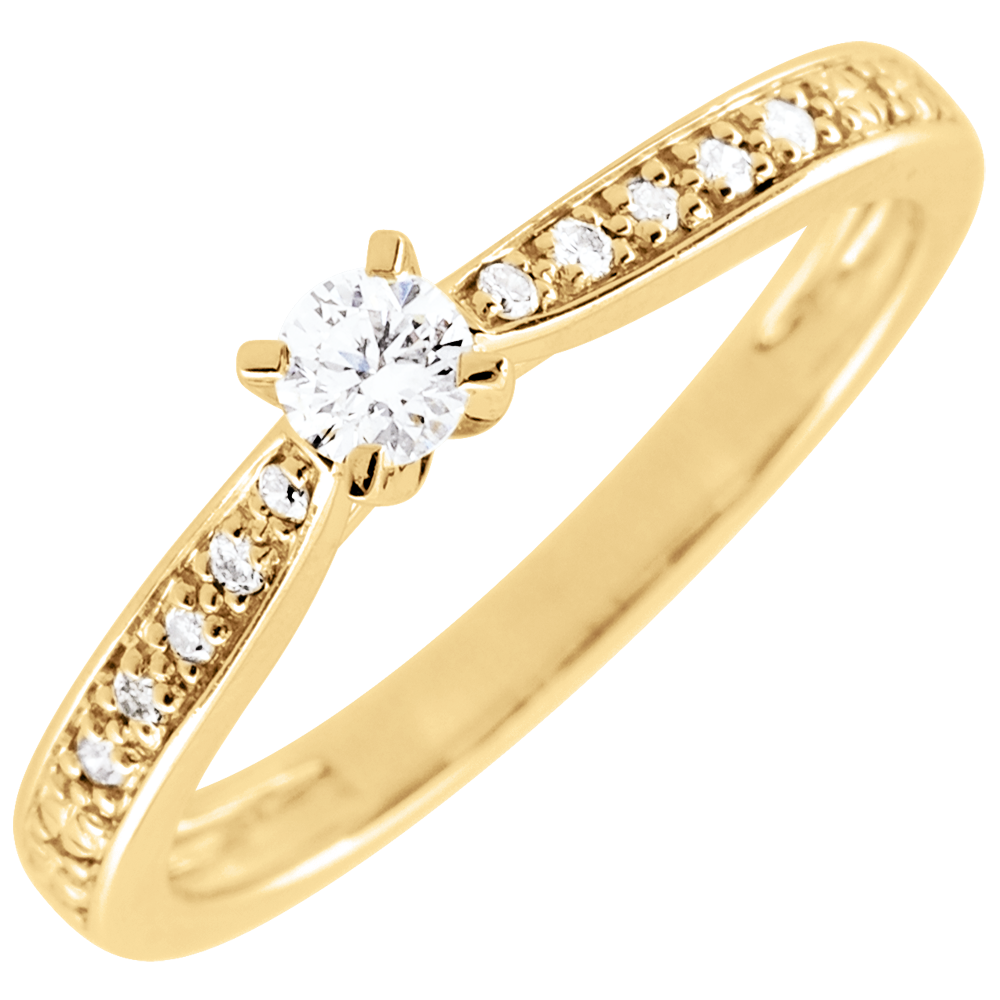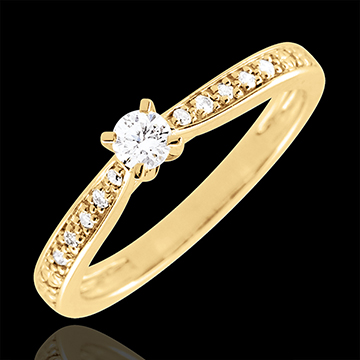 Diament środkowy w ośmiu krapach na wyrafinowanej obrączce usianej diamentami.