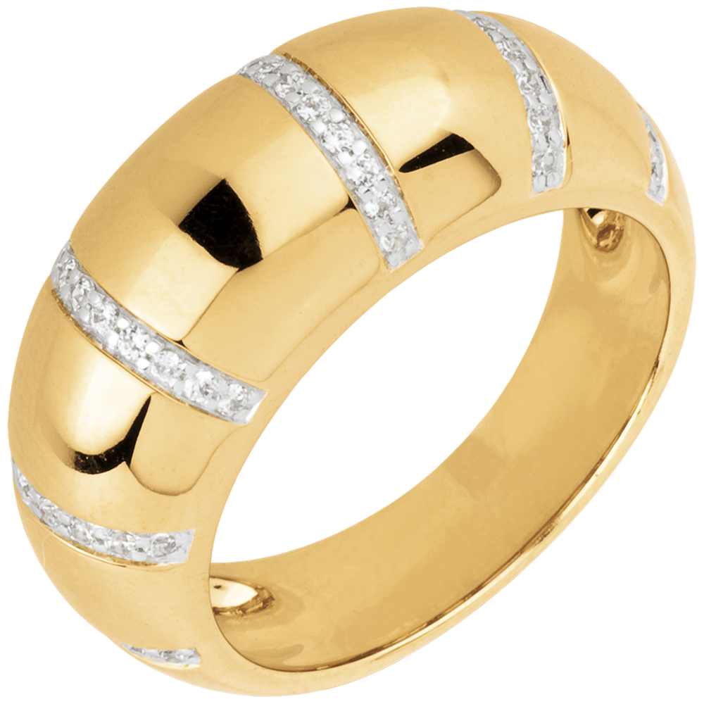 Subtelne linie oprawy diamentów na zaokrąglonej obrączce z żółtego złota.