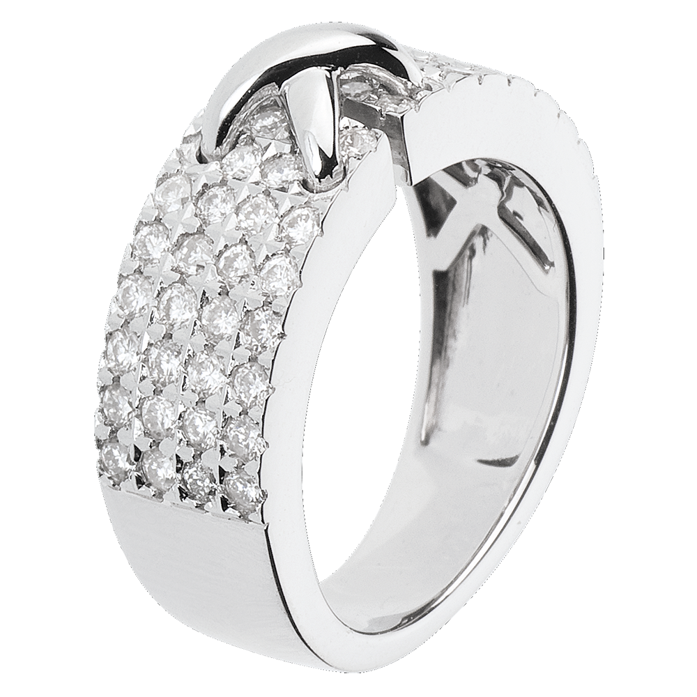 Pierścionek jest osadzony 60 diamentami o minimalnej jakości HSI, zapewniającymi dobre połączenie blasku i czystości.