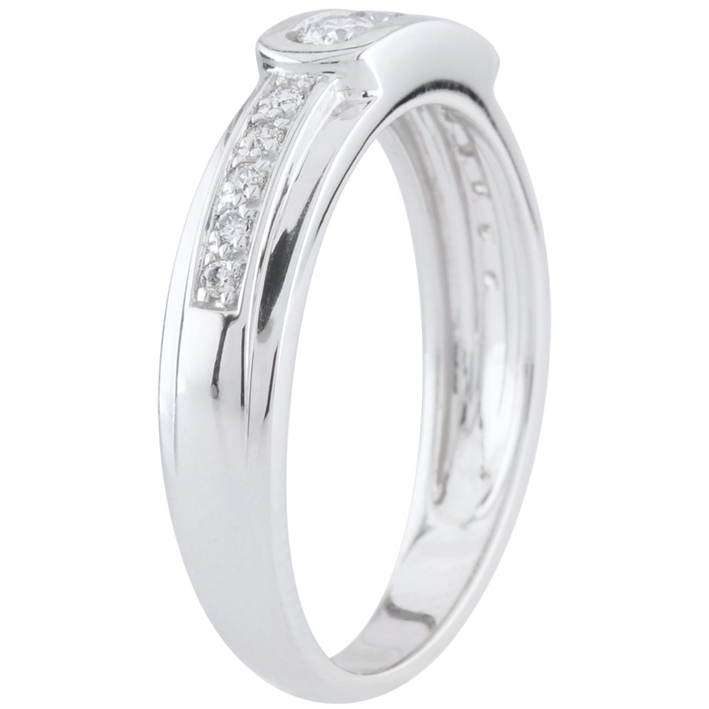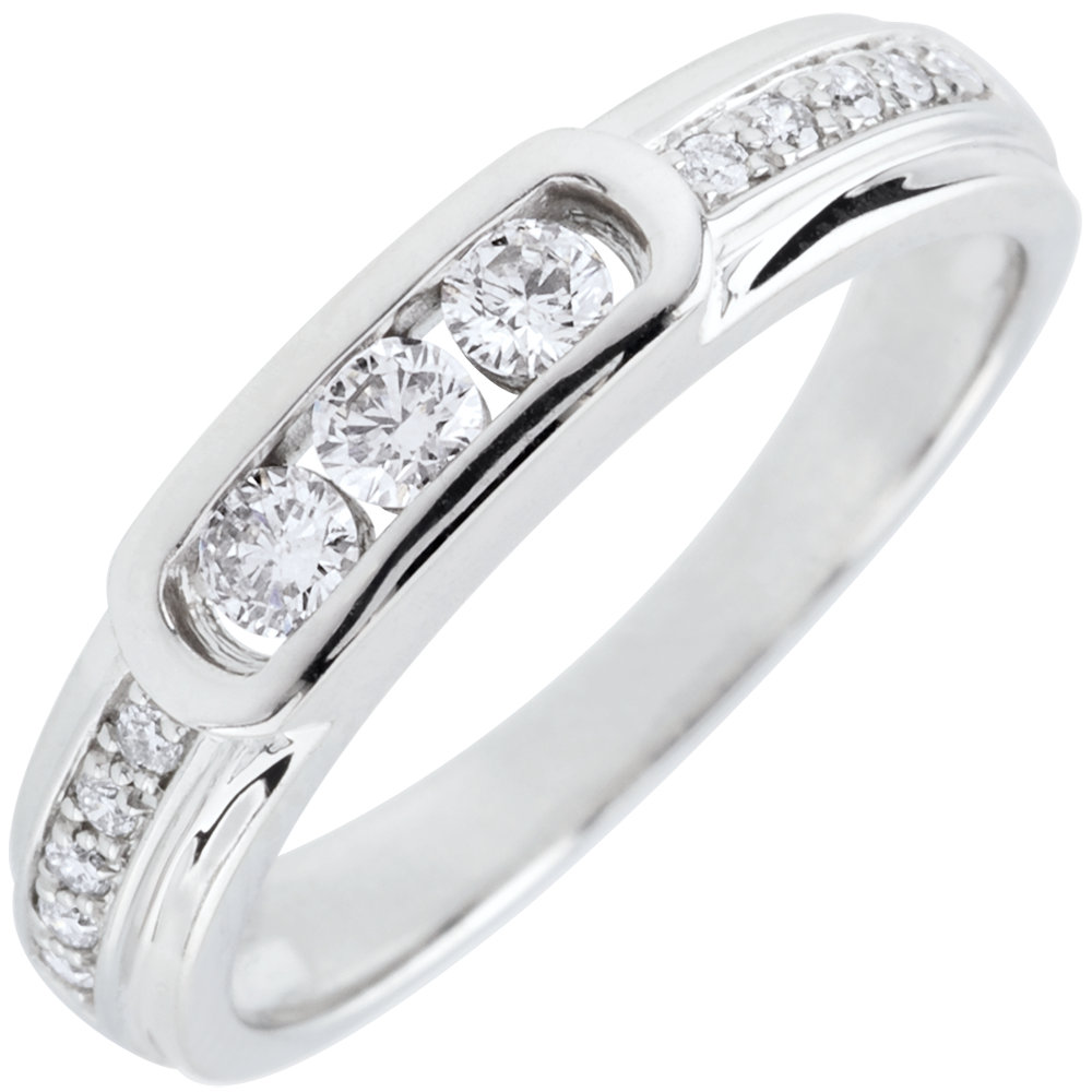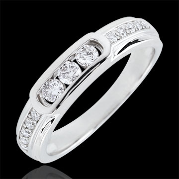 Trzy diamenty zatopione w białym złocie na korpusie obrączki wysadzanej diamentami.
