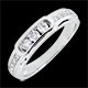 Trzy diamenty zatopione w białym złocie na korpusie obrączki wysadzanej diamentami.