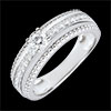 Pojedynczy diament jest podtrzymywany przez dwa rzędy złotych pereł otaczających obrączkę z diamentów. Pierścionek o błyszczącej i dominującej kobiecości.