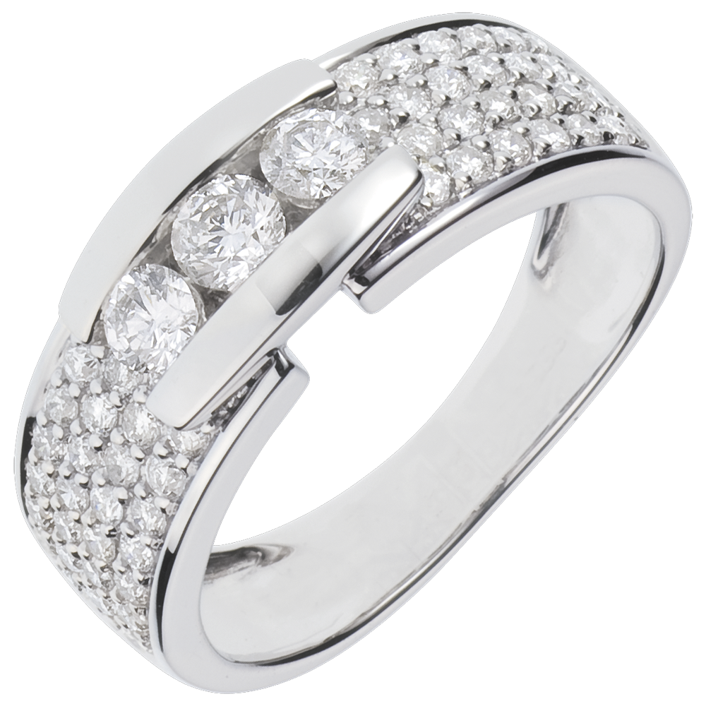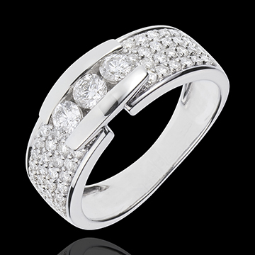 Trzy diamenty starannie osadzone między dwoma baskami z białego złota w oprawie bogato wysadzanej diamentami.