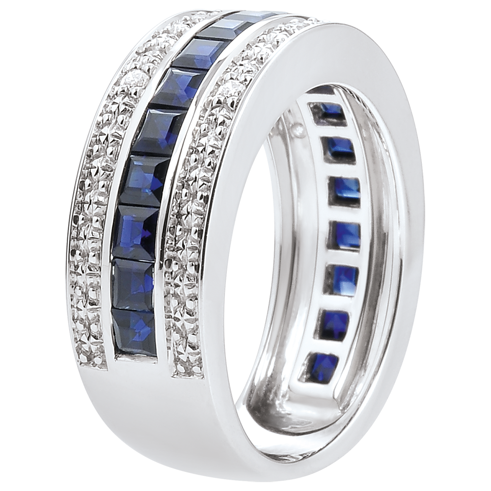 Elegancki pierścionek z białego złota wysadzany niebieskimi szafirami podkreślonymi dwoma rzędami diamentów i złotych kwiatów.