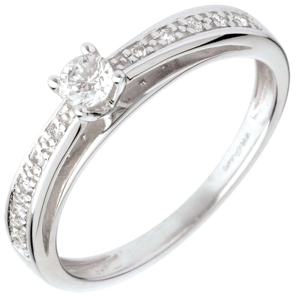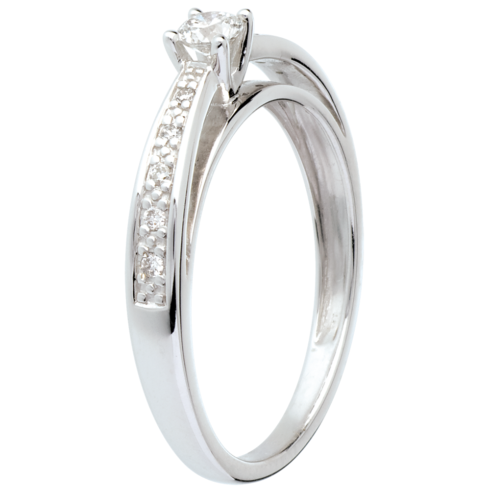 Pierścionek w kształcie łuku z białego złota 18-karatowego wysadzany diamentami, z jednym diamentem środkowym - diament 0,15 kar