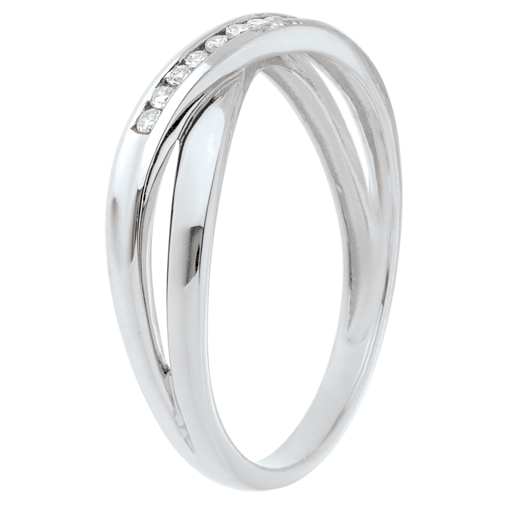 Obrączka z różowego złota skrzyżowana z obrączką z białego złota wysadzaną diamentami w czystej i nowoczesnej odsłonie