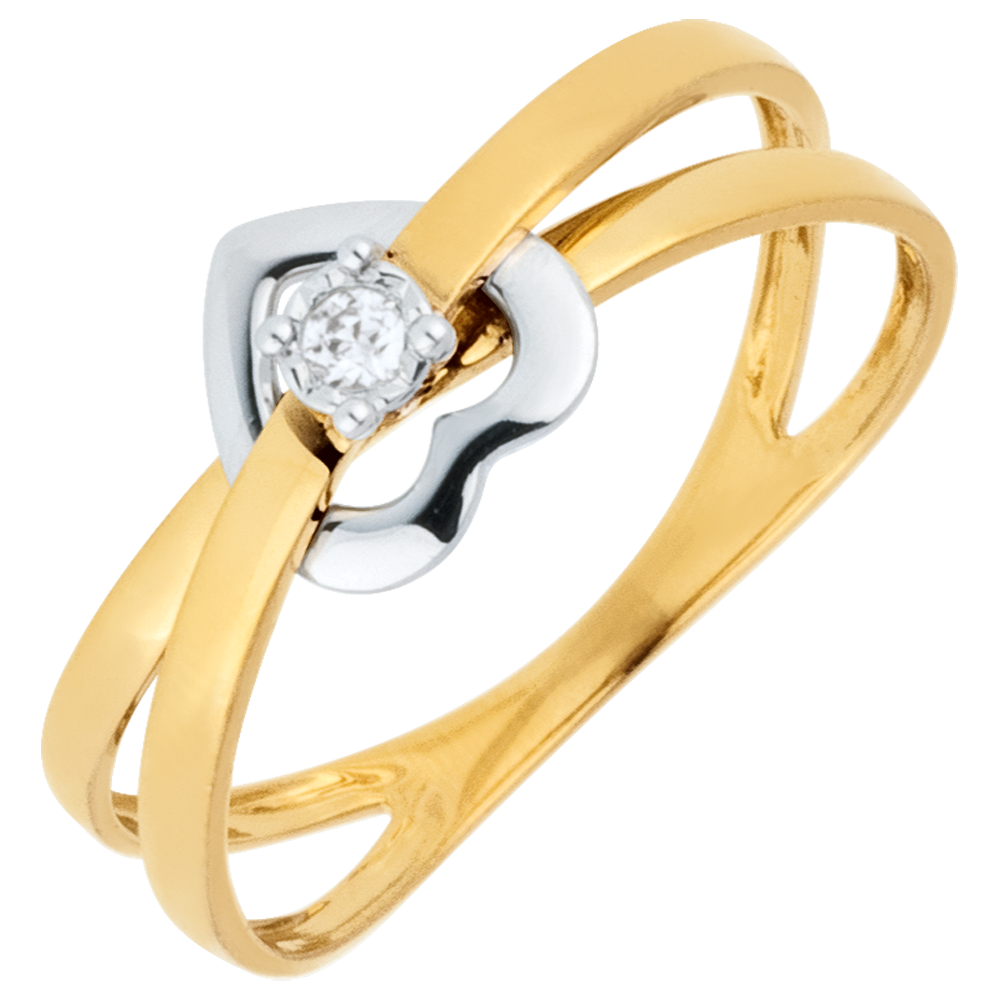 Serce z białego złota między dwoma obrączkami z żółtego złota i diamentem osadzonym w białym złocie.