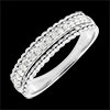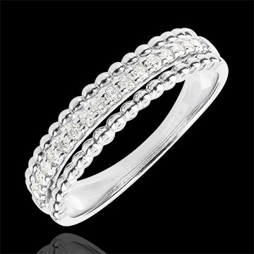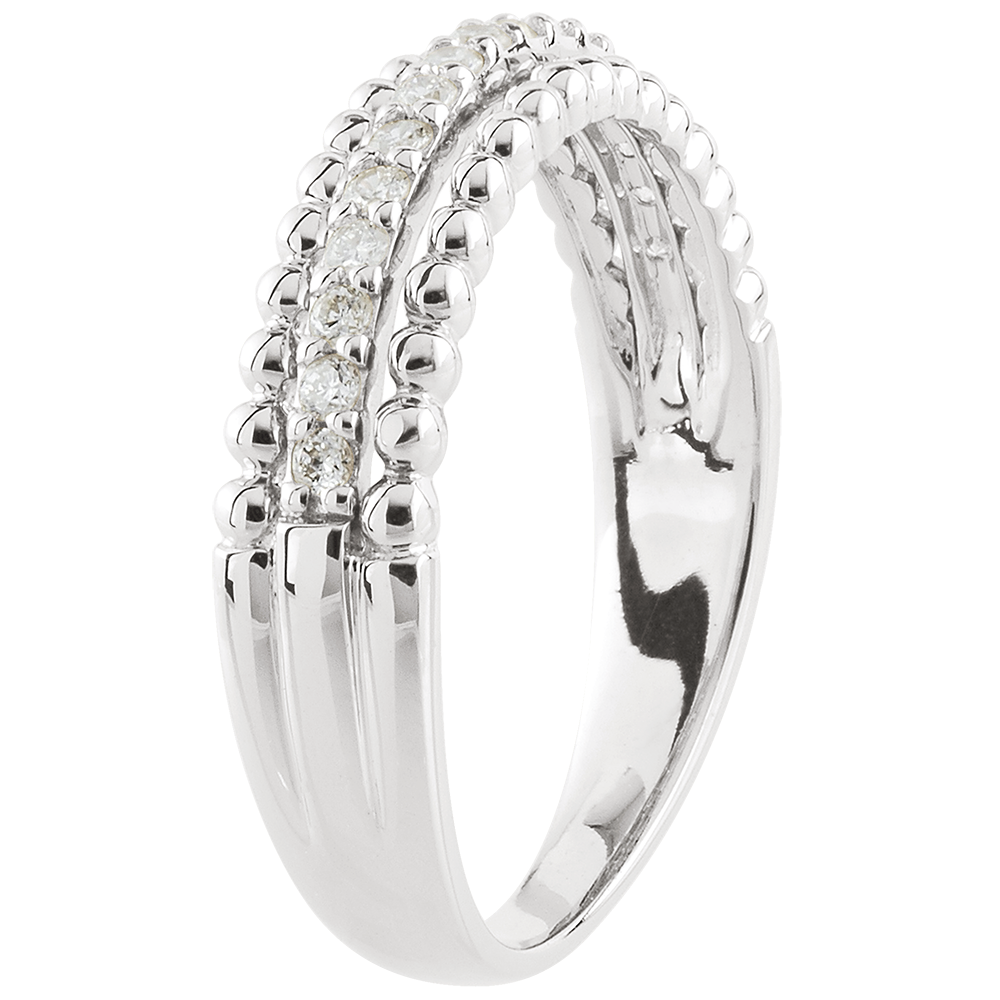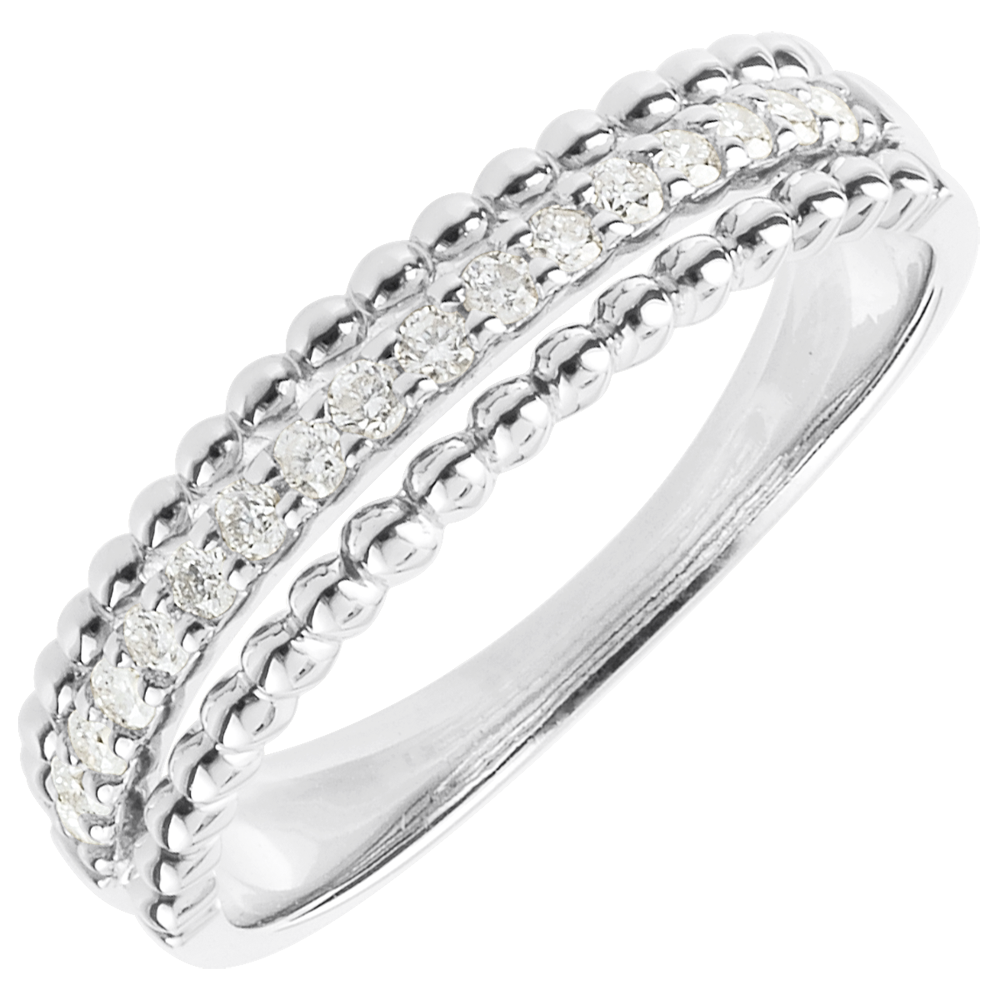 Dwa rzędy złotych pereł otaczających podniesioną obrączkę z diamentami. Niebanalna obrączka lub pierścionek łączące wyrafinowanie z elegancją.
