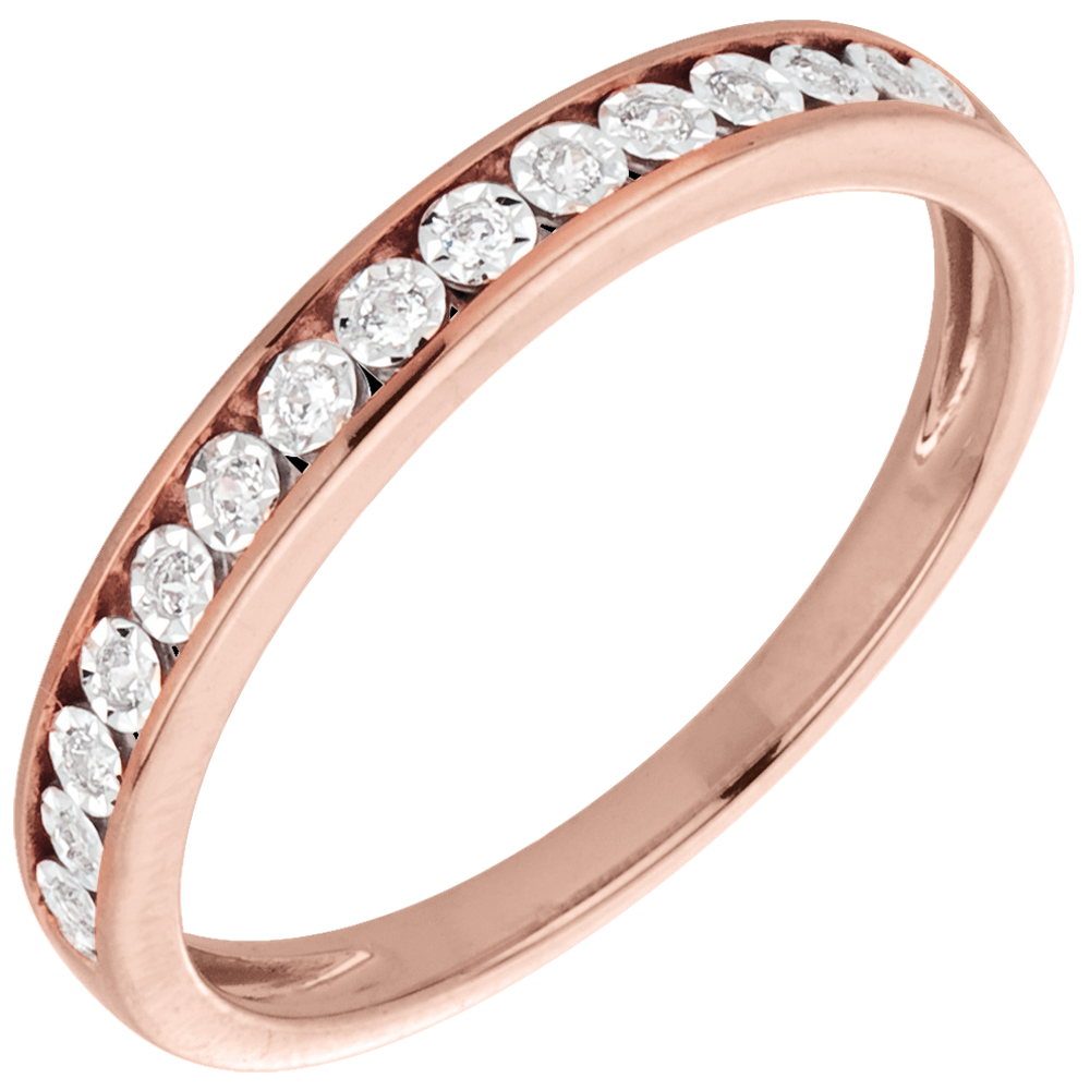 Obrączka z różowego złota z diamentami w oprawie z białego złota, które podkreślają blask całego klejnotu.