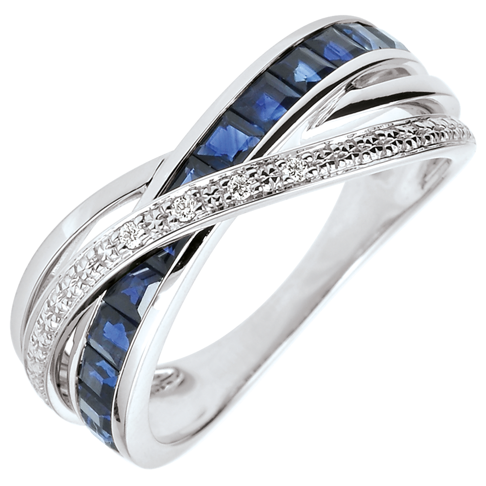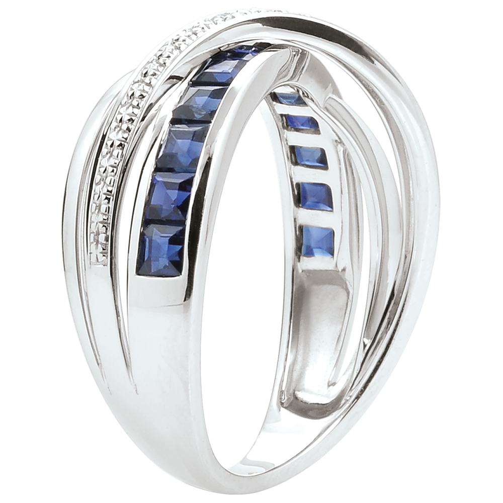 Wyrafinowany pierścionek z trzech obrączek z białego złota: jednej wysadzanej szafirami, jednej wysadzanej diamentami i jednej wykonanej w całości z białego złota.