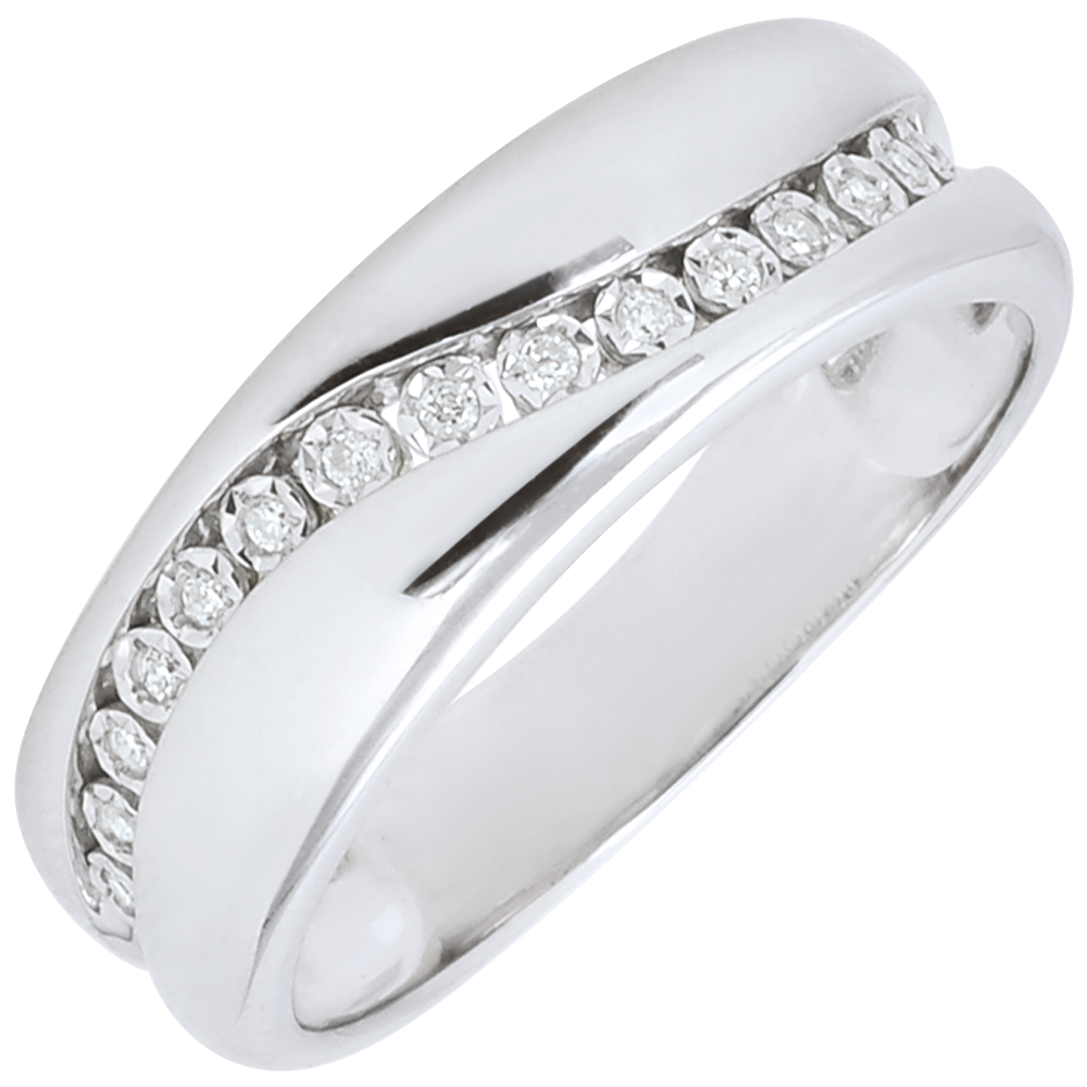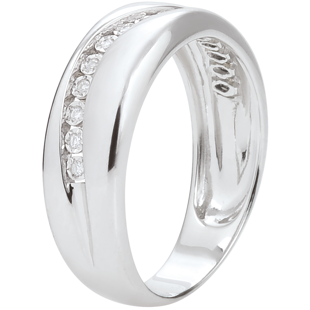 Obrączka z białego złota poprzecinana harmonijną krzywizną ozdobioną 15 diamentami. Pierścionek można nosić jako nowoczesną obrączkę lub wyjątkowy pierścionek.