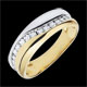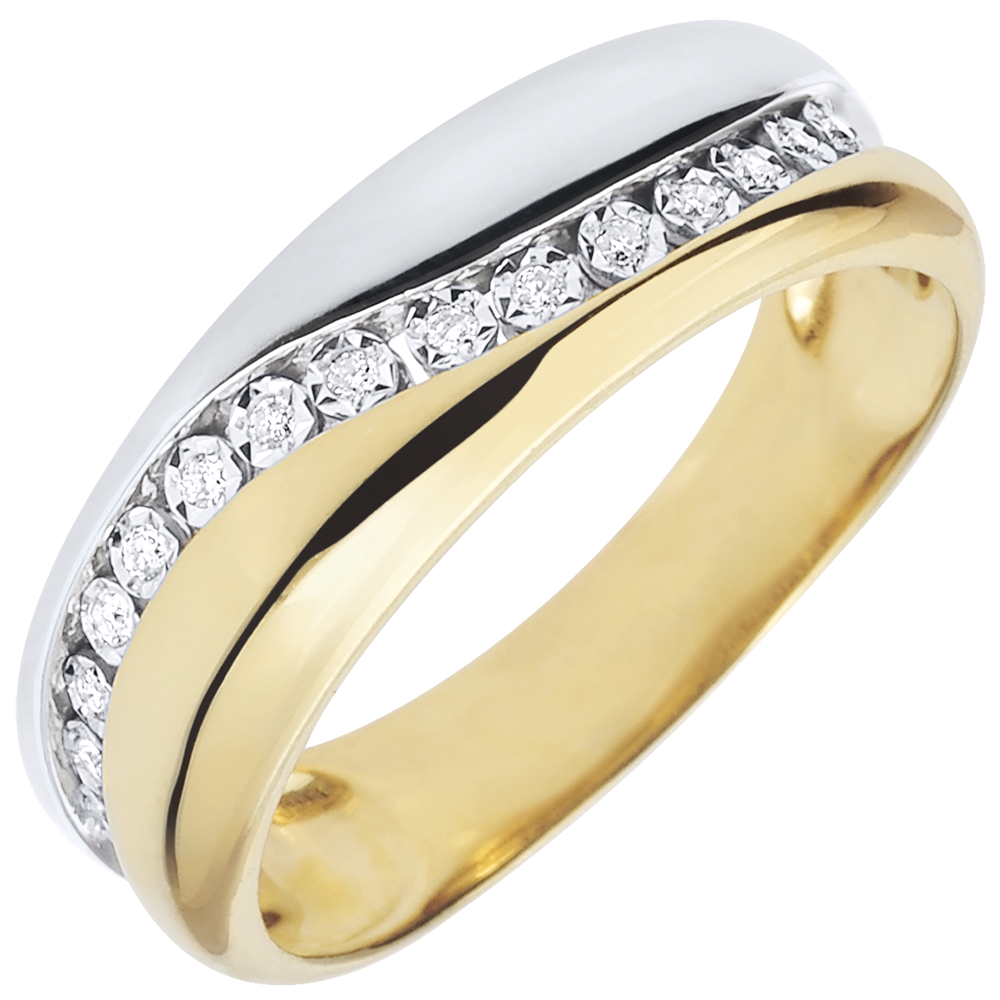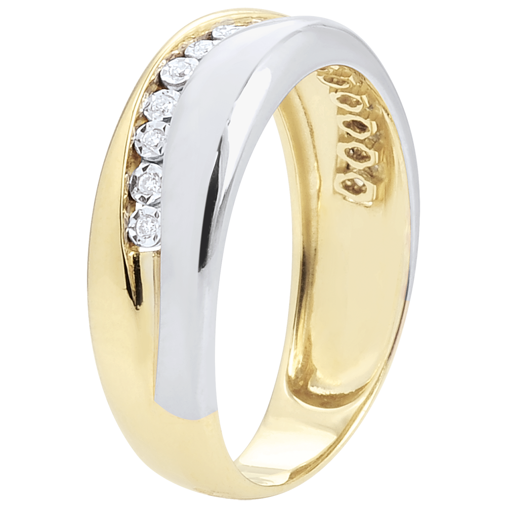 Obrączka gustownie łącząca złoto żółte i złoto białe, przecięta harmonijną krzywizną z 15 diamentami. Pierścionek można nosić jako nowoczesną obrączkę lub wyjątkowy pierścionek.