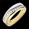 Obrączka gustownie łącząca złoto żółte i złoto białe, przecięta harmonijną krzywizną z 15 diamentami. Pierścionek można nosić jako nowoczesną obrączkę lub wyjątkowy pierścionek.