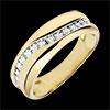 Obrączka z żółtego złota, przecięta harmonijną krzywą linią z 15 diamentami. Pierścionek można nosić jako nowoczesną obrączkę lub wyjątkowy pierścionek.