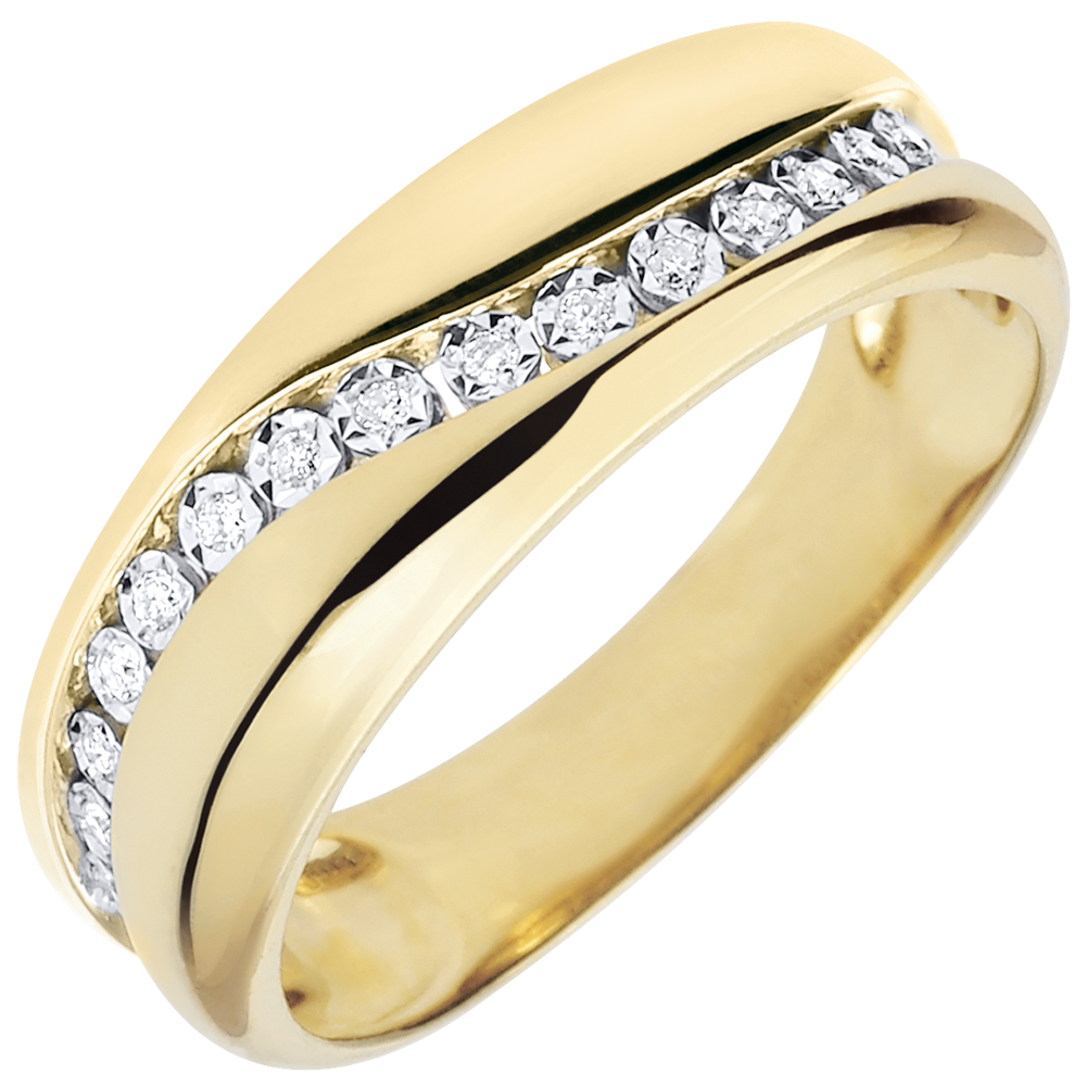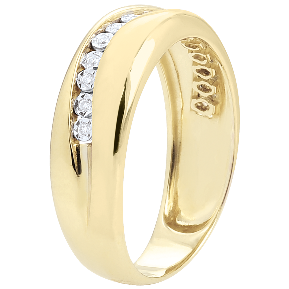 Obrączka z żółtego złota poprzecinana harmonijną krzywizną ozdobioną 15 diamentami. Pierścionek można nosić jako nowoczesną obrączkę lub wyjątkowy pierścionek.
