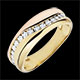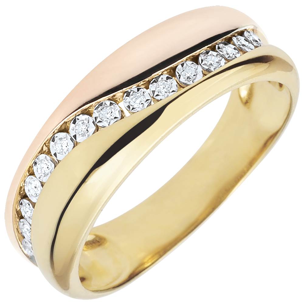 Obrączka gustownie łącząca złoto żółte i złoto różowe, przecięta harmonijną krzywizną z 15 diamentami. Nowoczesny pierścionek, który można nosić jako obrączkę lub wyjątkowy pierścionek.