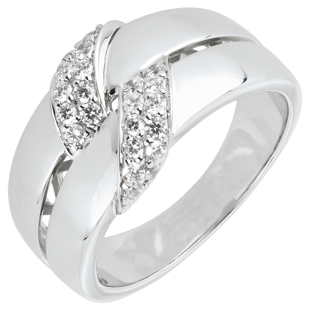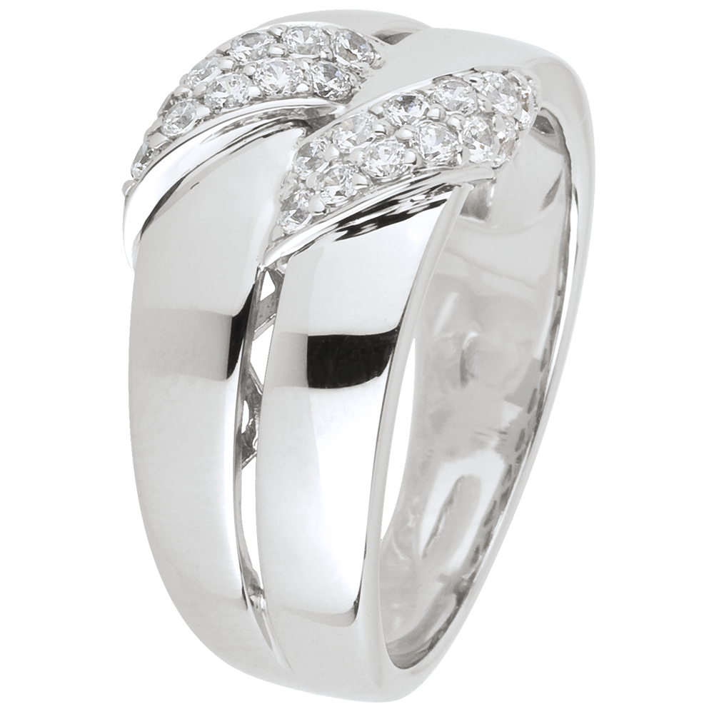Białe złoto wysadzane diamentami zwija się w kunsztownym uścisku wokół podwójnej obrączki.
